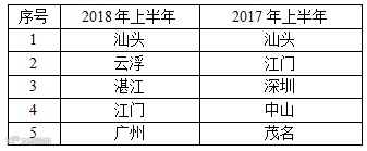表6 2018年上半年与去年同期美国FDA拒绝广东农食产品进口前5个地级市比对