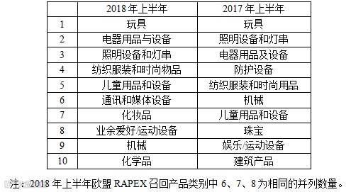 表3 2018年上半年与2017年上半年欧盟RAPEX召回产品前10位对比