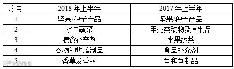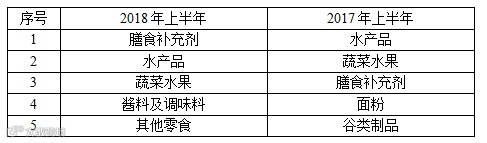 表8 2018年上半年与去年同期欧盟RASFF召回食品前5类产品比对
