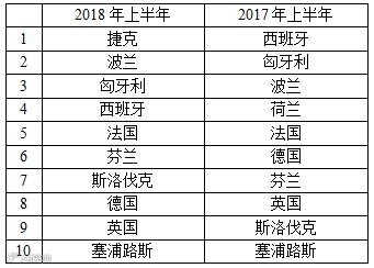 表4 2018年上半年与2017年上半年欧盟RAPEX发布召回前10位国家对比