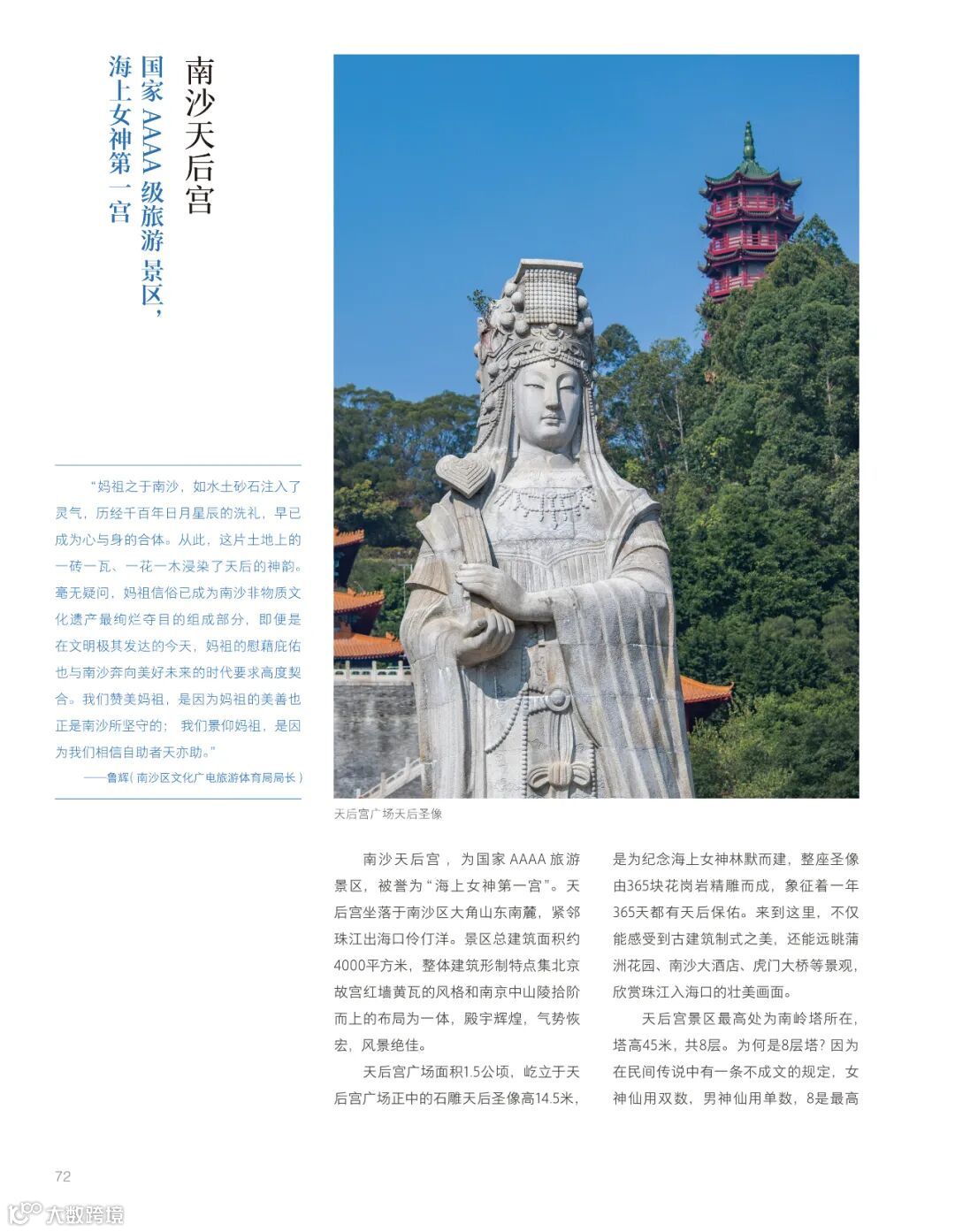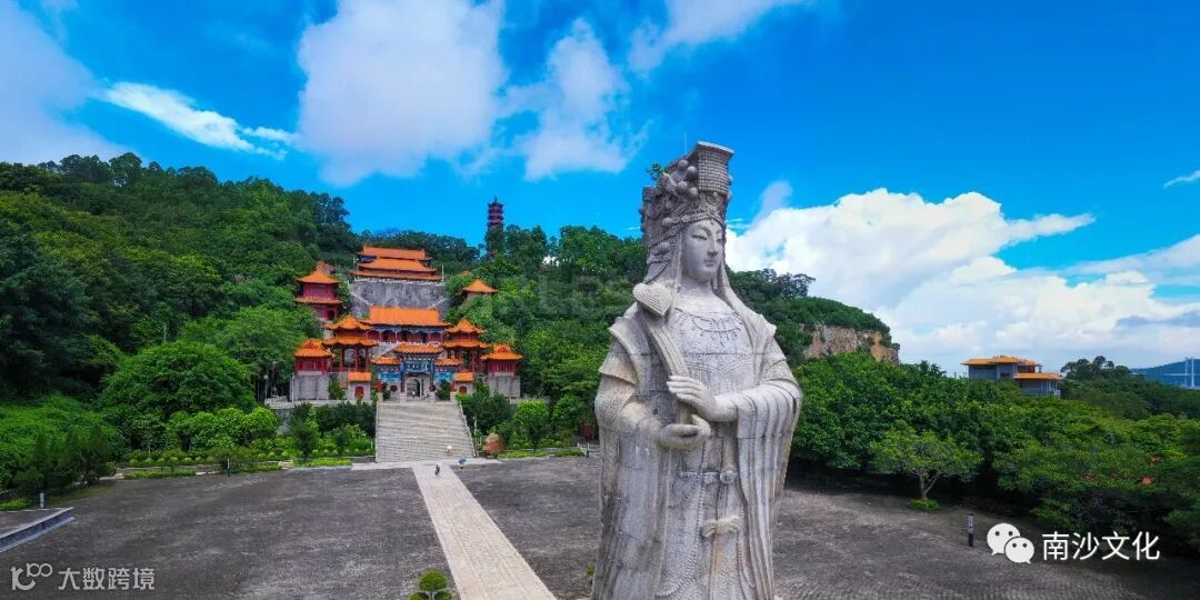 天后宫广场面积1.5公顷,屹立于天后宫广场正中的石雕天后圣像高14.5米是为纪念海上女神林默而建,整座圣像由365块花岗岩精雕而成,象征着一年365天都有天后保佑。来到这里,不仅能鋤臼睁摺Ề君鄉誂荜找鸌烁舒Ã鮰唧鲕渺伍到古建筑制式之美,还能远眺蒲洲花园、南沙大酒店、虎门大桥等景观,欣赏珠江入海口的壮美画面。