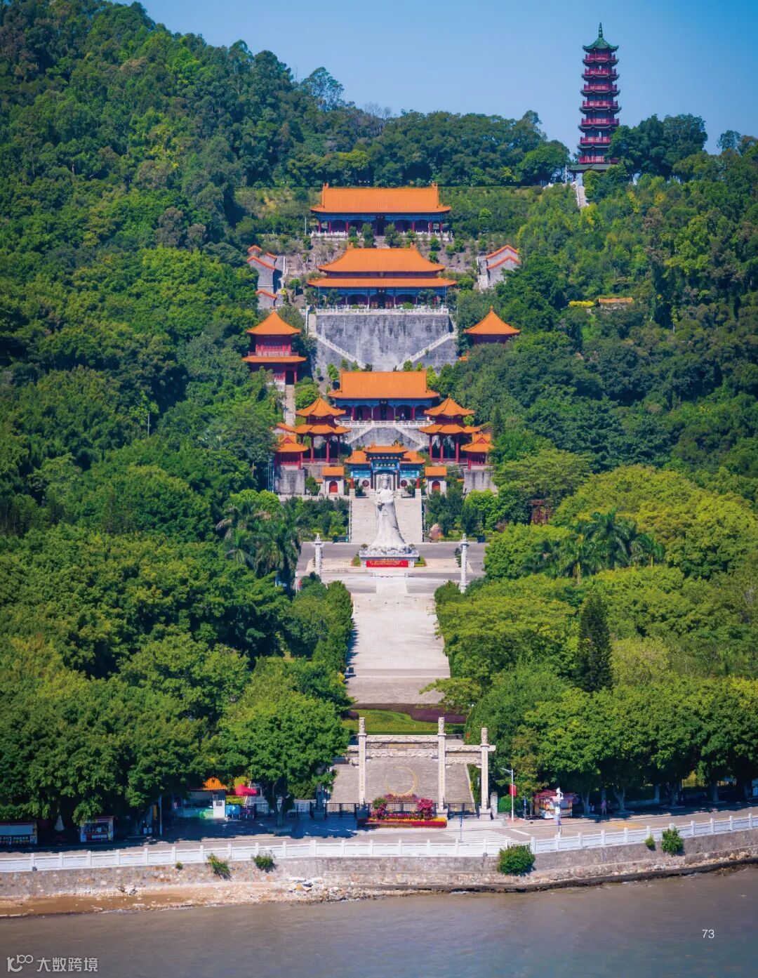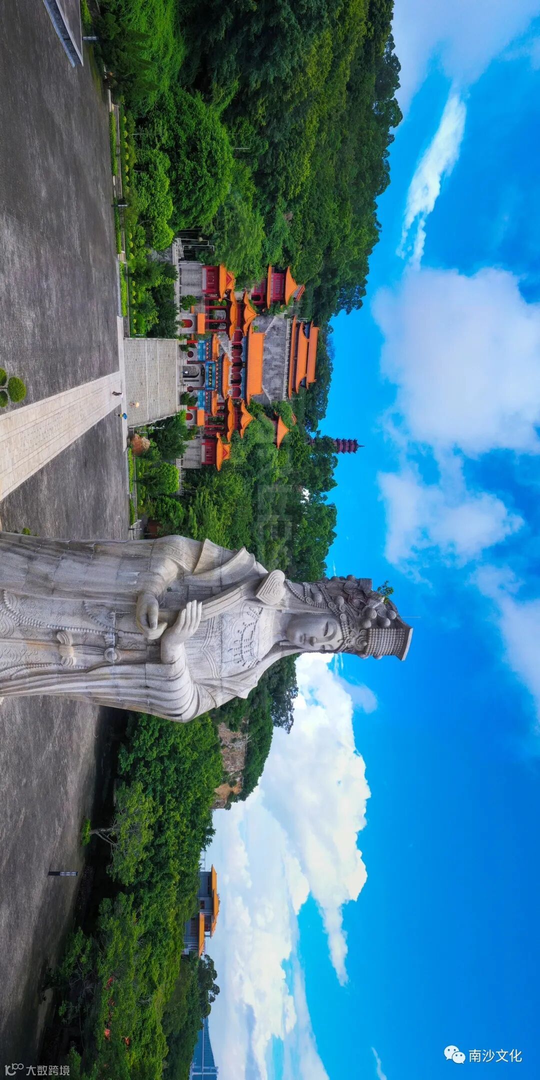 天后宫广场面积1.5公顷,屹立于天后宫广场正中的石雕天后圣像高14.5米是为纪念海上女神林默而建,整座圣像由365块花岗岩精雕而成,象征着一年365天都有天后保佑。来到这里,不仅能鋤臼睁摺Ề君鄉誂荜找鸌烁舒Ã鮰唧鲕渺伍到古建筑制式之美,还能远眺蒲洲花园、南沙大酒店、虎门大桥等景观,欣赏珠江入海口的壮美画面。