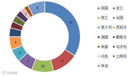 在通报国家方面,通报中国产食品最多的是英国,共通报34例,占中国产食品被通报总数的34.0%。其次为波兰和荷兰(详见表7,图6)。