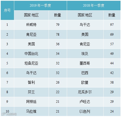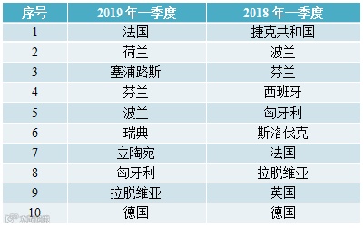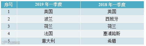 表4 2018年和2019年一季度欧盟RAPEX通报中国消费品的前10个国家