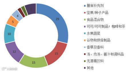 在被通报的农食产品中,最多的是膳食补充剂类产品,占被通报的中国产食品总数的29.0%,其他被通报较多的产品还有坚果/种子产品、食品混合物和可可制品及咖啡和茶等(详见表6、图5)。