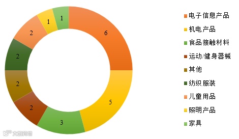 其中来自中国的产品(消费品)共24例,同比减少48.9%,占同期CPSC召回总数的61.5%,比重较去年同期减少3.7个百分点,涉及在美国和加拿大境内销售的产品约138.6万件,涉及金额约8072.5万美元。召回最多的是电子信息产品(详见表2、图2)。