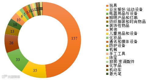 被通报最多的产品为玩具(48.6%),其次为业余爱好/运动设备(10.8%)、电器用品与设备(10.2%)、照明设备和灯串(8%)(详见表3、图3)。