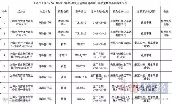 抽检发现,不合格商品最高车速实测均超过标准值(国家标准应不大于20km/h)。如上海奉贤大润发商贸有限公司销售的标称由苏州龙跃锂动车辆有限公司生产的“珑玥LONG YEAH”牌电动自行车(型号规格:TDR1202Z;生产日期或批号:2016-04-19),最高车速实测为28.7km/h。