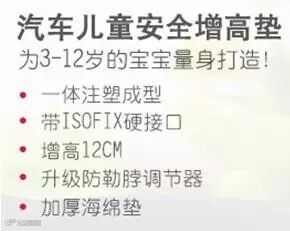 3、根据儿童的身高体重选购不同类型的儿童安全座椅或增高垫产品,注意身高不在1.2米以上的儿童建议选购儿童安全座椅;