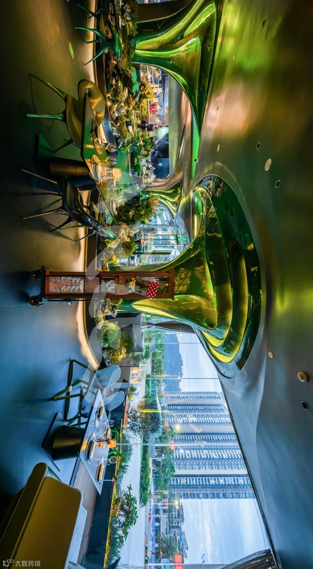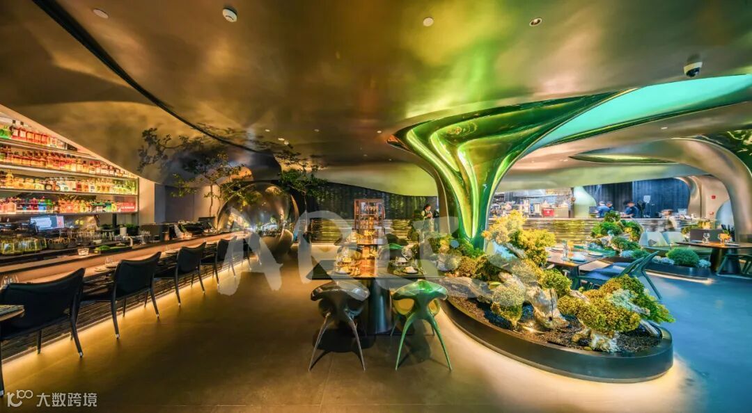 “未来花园幻境”理念在踏入餐厅的刹那便扑面而来。共和都市RMA创始人黄永才操刀的设计,将神话大鹏鸟的意象解构成四根幻彩碳纤维羽毛柱,如同潘多拉星球的发光植物般矗立空间