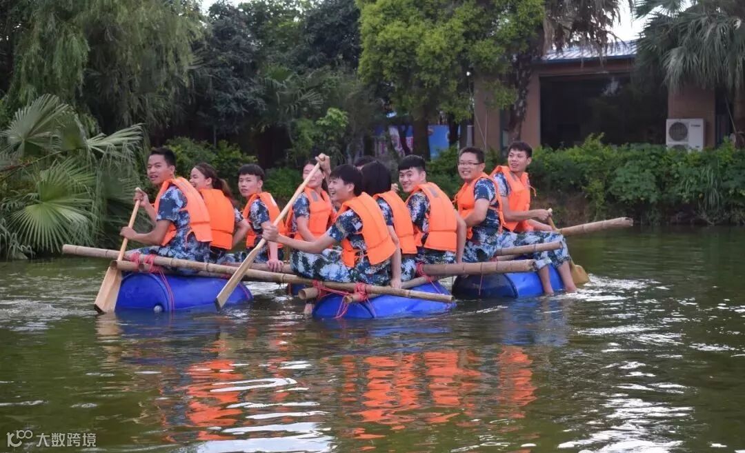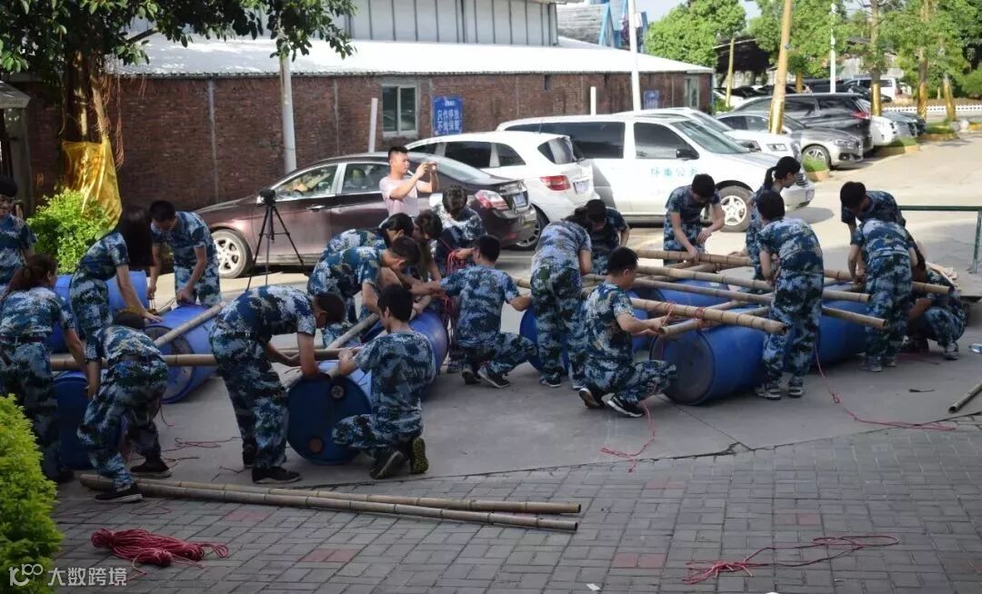 最后一个项目是抢滩登陆,模拟副队长被敌人挟持到孤岛上,每个小组分配4个油桶、8根竹竿、一捆绳子,小组必须以最快的速度捆绑竹竿,固定油桶,形成船只,并且移动到水面上,载上所有队友通过划船的方式,迅速抢滩营救副队长。