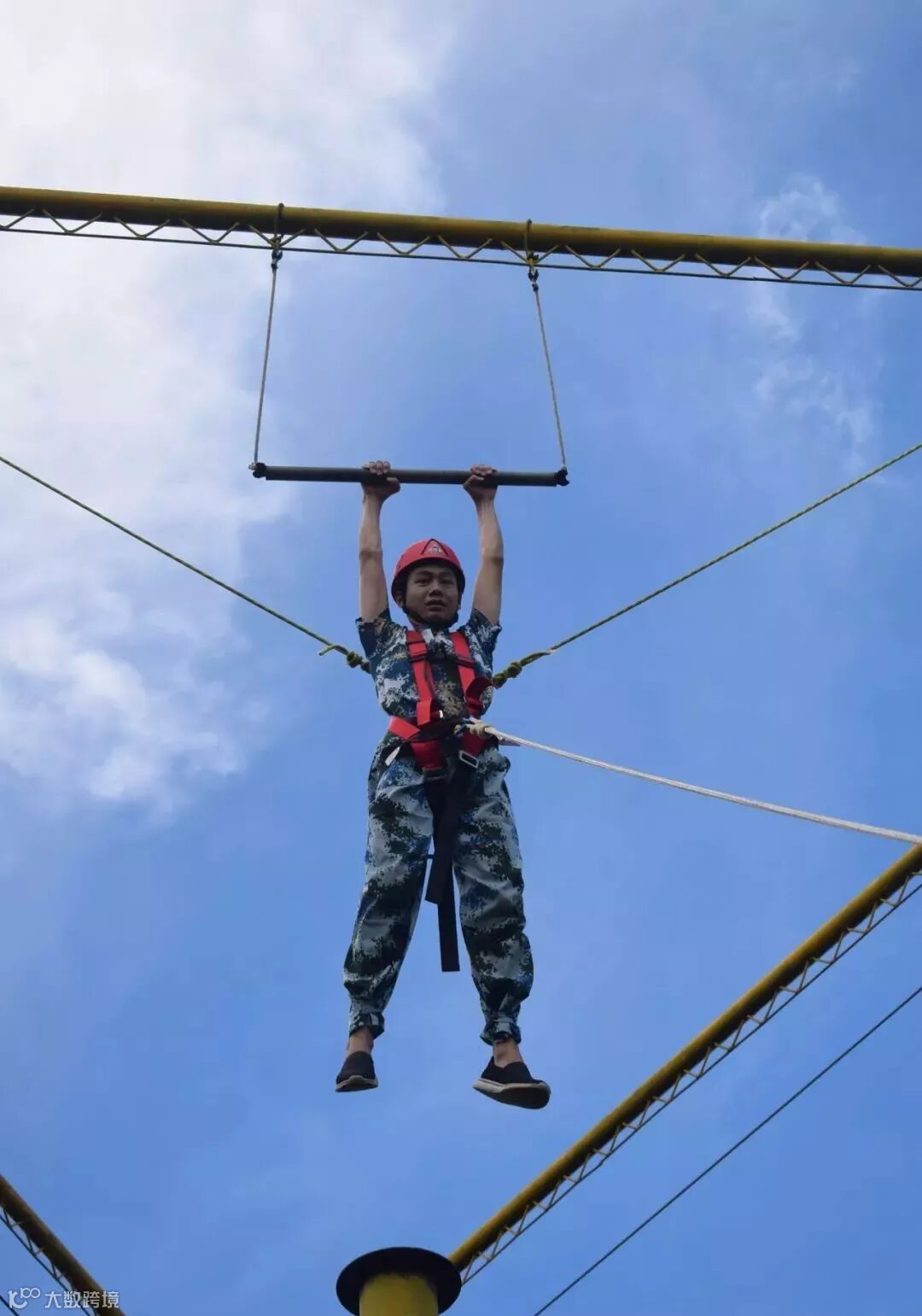 刚开始,好多队员们都非常的紧张。8米高的跳台,高过10米的三脚架,悬空前方的抓杆,不断颤抖的双腿,一遍一遍的问自己:“我能抓到吗?我行吗?”