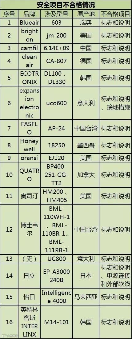 安全项目不合格产品,涉及Blueair、brighton、camfil、clean air、ECOTRONIX、expansion electronic、FASFLO、Honeywell、oransi、QUATRO、奥司汀、博士韦尔、日立、怡口、英特林客斯INTER LINX等品牌。