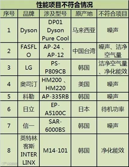 性能项目不符合产品,涉及Dyson、FASFLO、LG、奥司汀、科勒、日立、信一、英特林客斯INTER LINX等品牌。