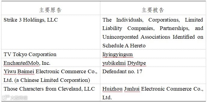Valderrama法官审理的知识产权诉讼案件主要集中在商标、版权与专利领域。其中,商标诉讼案件的原告主要集中在电视台、影视娱乐或动画制作公司、运动品牌、足球俱乐部等,被告主要集中在外贸公司或电商企业。版权案件的原告主要集中在影视娱乐或动画制作公司、电视台、游戏制作公司、外贸公司或电商企业,被告主要集中在外贸公司或电商企业。专利案件的原告主要集中在电子商务公司、运动品牌、照明公司、电子烟公司、保健品公司等;被告主要集中在玩具公司、办公用品制造公司、电商企业等。值得注意的是,商标、版权诉讼案件中有较多被告以附表A(Schedule A)形式出现。