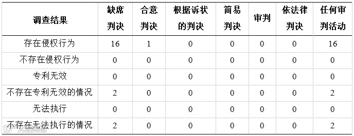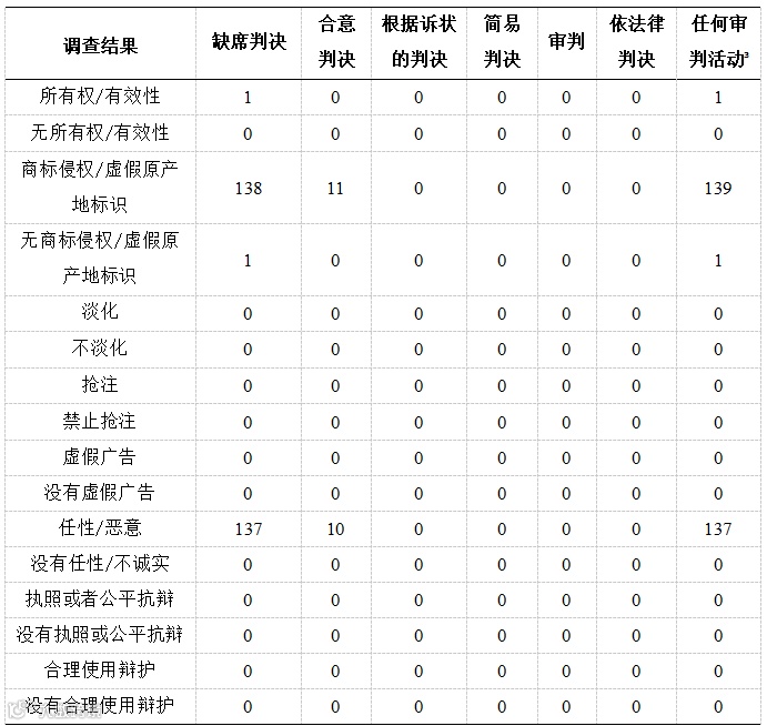 商标调查结果中认定存在商标侵权、虚假原产地标识、抢注、恶意行为的判决以缺席判决为主,其余少部分集中在合意判决。版权调查结果中认定存在版权侵权、恶意行为的判决以缺席判决为主,少部分集中在合意判决;少数认定不存在侵权行为的判决集中在缺席判决和简易判决。专利调查结果中认定存在侵权行为的判决以缺席判决为主,没有案件被认定不存在专利侵权行为。