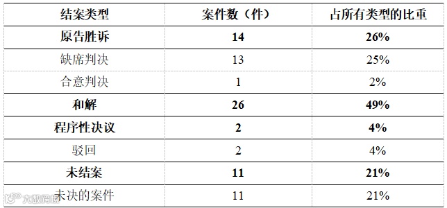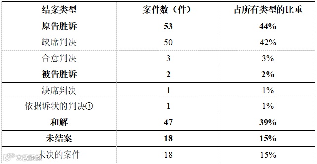 商标诉讼方面,案件审理结果以“原告胜诉”结案为主,比重为64%,主要为缺席判决胜诉;以“和解”结案的比重为21%;不存在被告胜诉的情况。版权诉讼方面,案件审理结果以“原告胜诉”为主,比重为44%,主要为缺席判决胜诉;以“和解”结案的比重为39%;仅2%的案件以“被告胜诉”结案。专利诉讼方面,案件审理结果以“和解”结案为主,占49%,以“原告胜诉”结案的案件占26%,没有案件以“被告胜诉”结案。