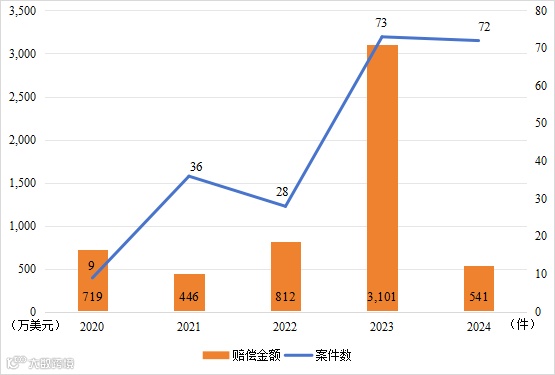 Valderrama法官判决的案件中涉及商标赔偿案件数量最多,达135件,赔偿金额共计109.54万美元;涉及版权案件50件,赔偿金额共计449.15万美元;涉及专利案件3件,赔偿金额0美元。值得注意的是,诉讼判赔案件数量自其上任以来整体呈波动上升趋势,到2023年达顶峰值73件,2024年轻微回落;判赔金额波动变化,2023年骤增至历年顶峰值3101万美元,随后2024年骤降。