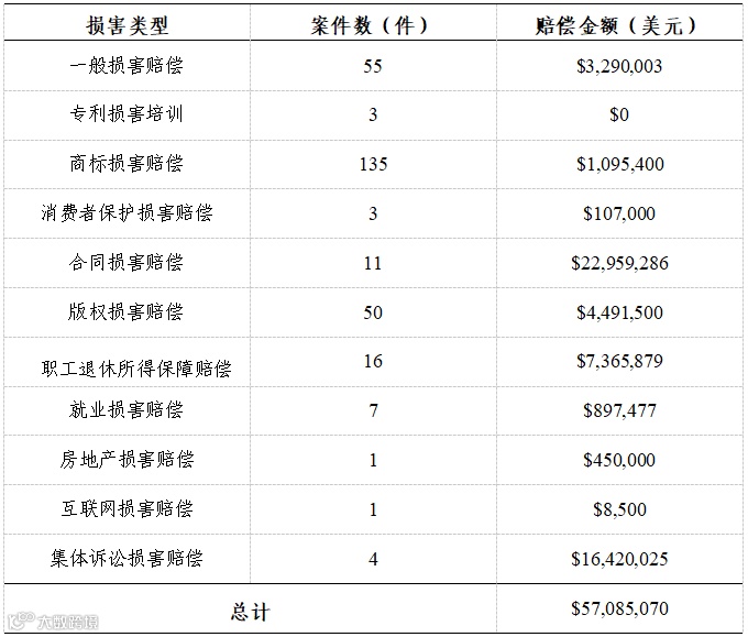 表10 损害赔偿案件及赔偿金额情况