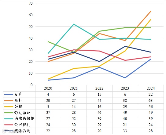 2020年至2024年间Valderrama法官审理的案件类型主要集中在劳动争议、消费者保护、商标、集体诉讼等领域,其中审理的劳动争议案件最多,高达209件。知识产权诉讼案件中,商标、专利案件量呈波动上升趋势,版权案件量稳定增长。²