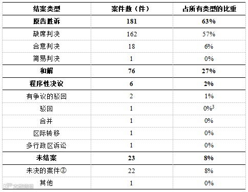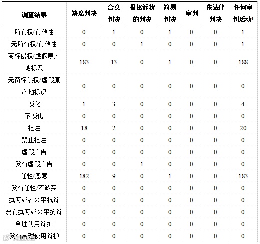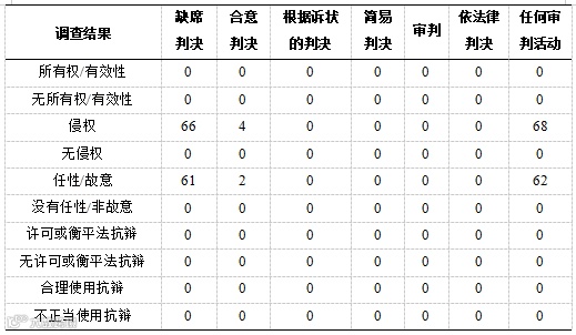 商标调查结果中认定存在商标侵权、虚假原产地标识、抢注、恶意行为的判决以缺席判决为主,其余少部分集中在合意判决。版权调查结果中认定存在版权侵权、恶意行为的判决以缺席判决为主,少部分集中在合意判决。专利调查结果中认定存在侵权行为的判决以缺席判决为主,认定不存在专利侵权行为主要集中在简易判决。