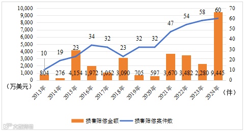 Ellis法官判决的案件中涉及商标赔偿的案件数量最多,达179件,赔偿金额共计135.29万美元。涉及版权案件52件,赔偿金额共计421.51万美元。涉及专利赔偿的案件量共3件,赔偿金额共计312.8万美元。诉讼判赔案件数量自其上任以来总体呈波动上升趋势,2023年达到历年最高值60件;赔偿金额波动较大,2024年达到顶峰9445万美元。