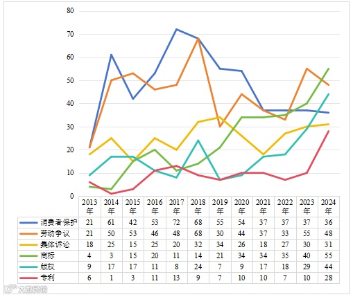 2013—2024年间Ellis法官审理的案件类型主要集中在消费者保护、劳动争议、集体诉讼、商标等领域,其中审理的消费者保护案件最多,高达573件。知识产权诉讼中,商标、版权、专利案件量均呈波动增长趋势,其中2023—2024年商标、专利案件增长速度较快,2022—2024年版权案件增长速度较快。²