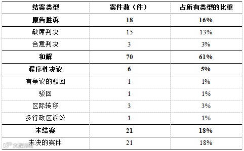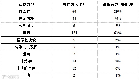 商标诉讼方面,案件审理结果以“原告胜诉”结案为主,比重为63%,主要为缺席判决胜诉;以“和解”结案比重为27%。版权诉讼方面,案件审理结果以“和解”结案为主,比重为62%;以“原告胜诉”结案占比29%,主要为缺席判决胜诉。专利诉讼方面,案件审理结果以“和解”结案为主,比重为61%;以“原告胜诉”结案占比16%,主要为缺席判决胜诉。Ellis法官审理的商标、版权、专利诉讼均没有以“被告胜诉”结案的案件。