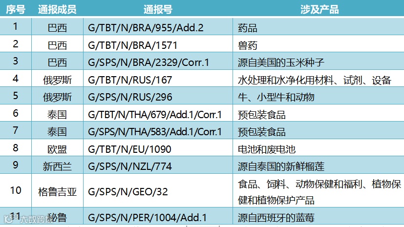 2024年10月15日,共有7个WTO成员通报了11项技术性贸易措施,其中5项为TBT措施,6项为SPS措施。通报情况为:巴西3项、俄罗斯2项、泰国2项、欧盟1项、新西兰1项、格鲁吉亚1项、秘鲁1项。这些措施涉及药品,兽药,水处理和水净化用材料、试剂、设备,预包装食品,电池和废电池,食品、饲料、动物保健和福利、植物保健和植物保护产品等。通报详情如表所示。