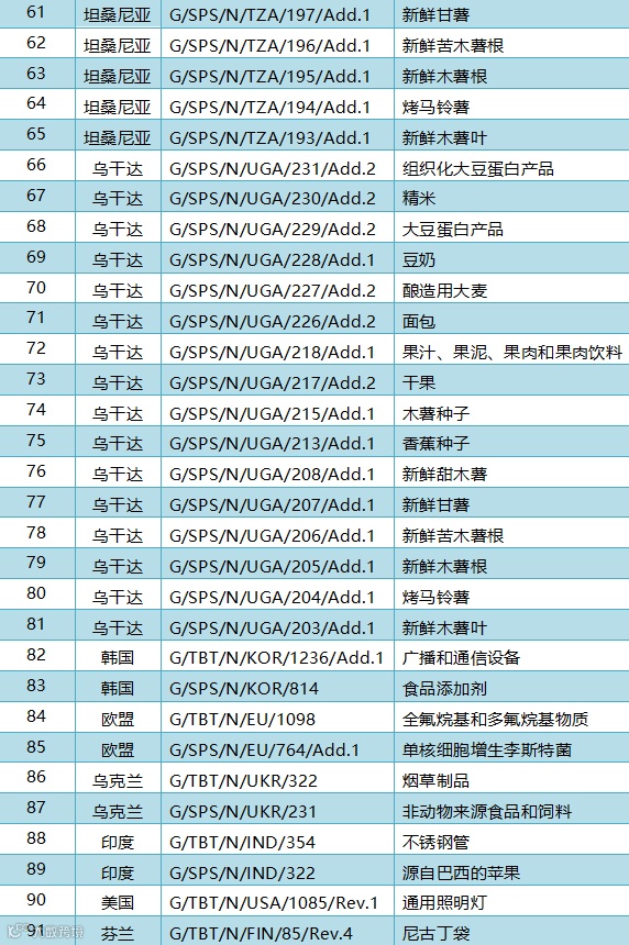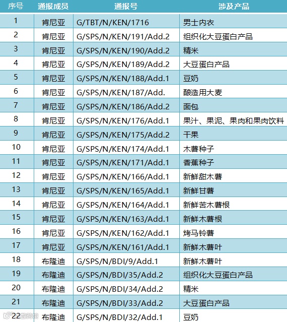 2024年11月26日,共有11个WTO成员通报了91项技术性贸易措施,其中7项为TBT措施,84项为SPS措施。通报情况为:肯尼亚17项、布隆迪16项、卢旺达16项、坦桑尼亚16项、乌干达16项、韩国2项、欧盟2项、乌克兰2项、印度2项、美国1项、芬兰1项。这些措施涉及男士内衣,精米,面包,香蕉种子,广播和通信设备,食品添加剂,全氟烷基和多氟烷基物质,烟草制品,通用照明灯,尼古丁袋等。通报详情如表所示。