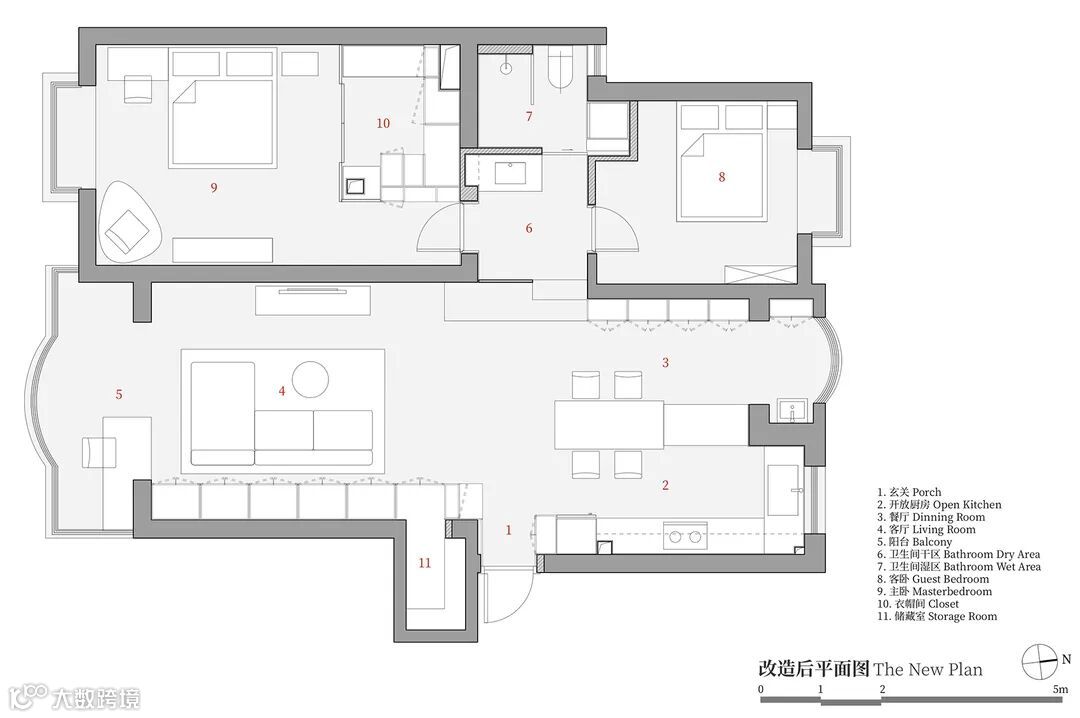 这是一套老房改造项目。原本布局比较密集,有着传统的封闭式厨房。改造后把厨房拆除,打通格局,形成餐厨一体式空间。南北贯通的格局不仅带来更好的自然光和空气的流通,更是成为业主二人主要的活动空间--聊天、看书、会有、进餐、做饭全都在这里展开。