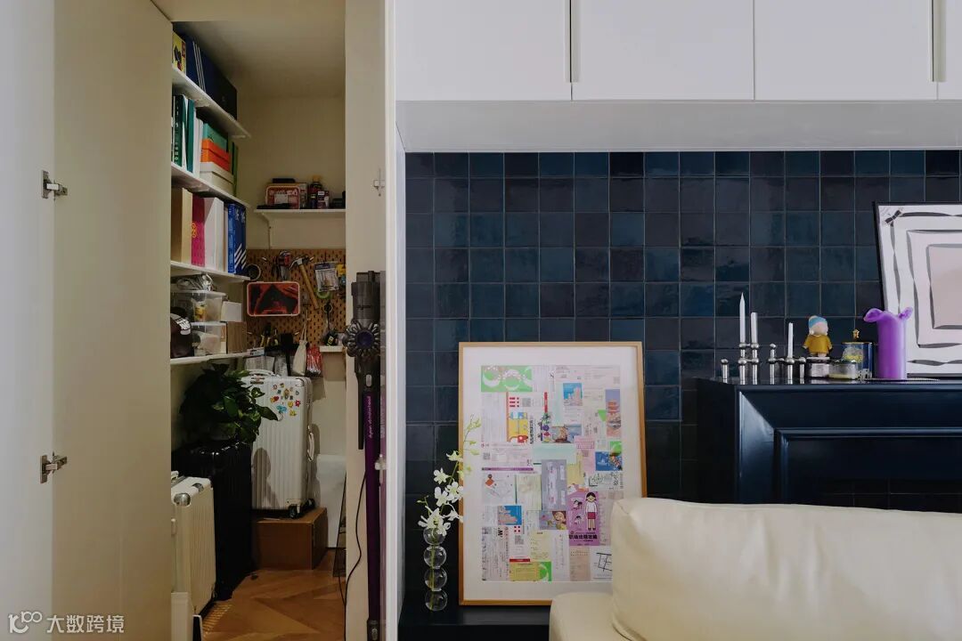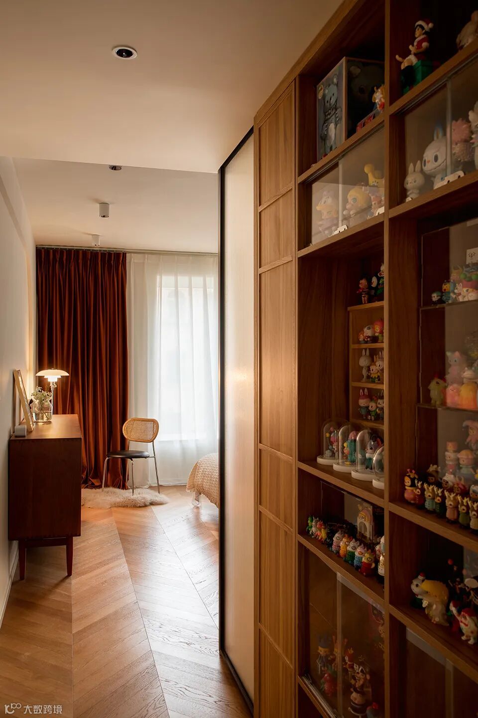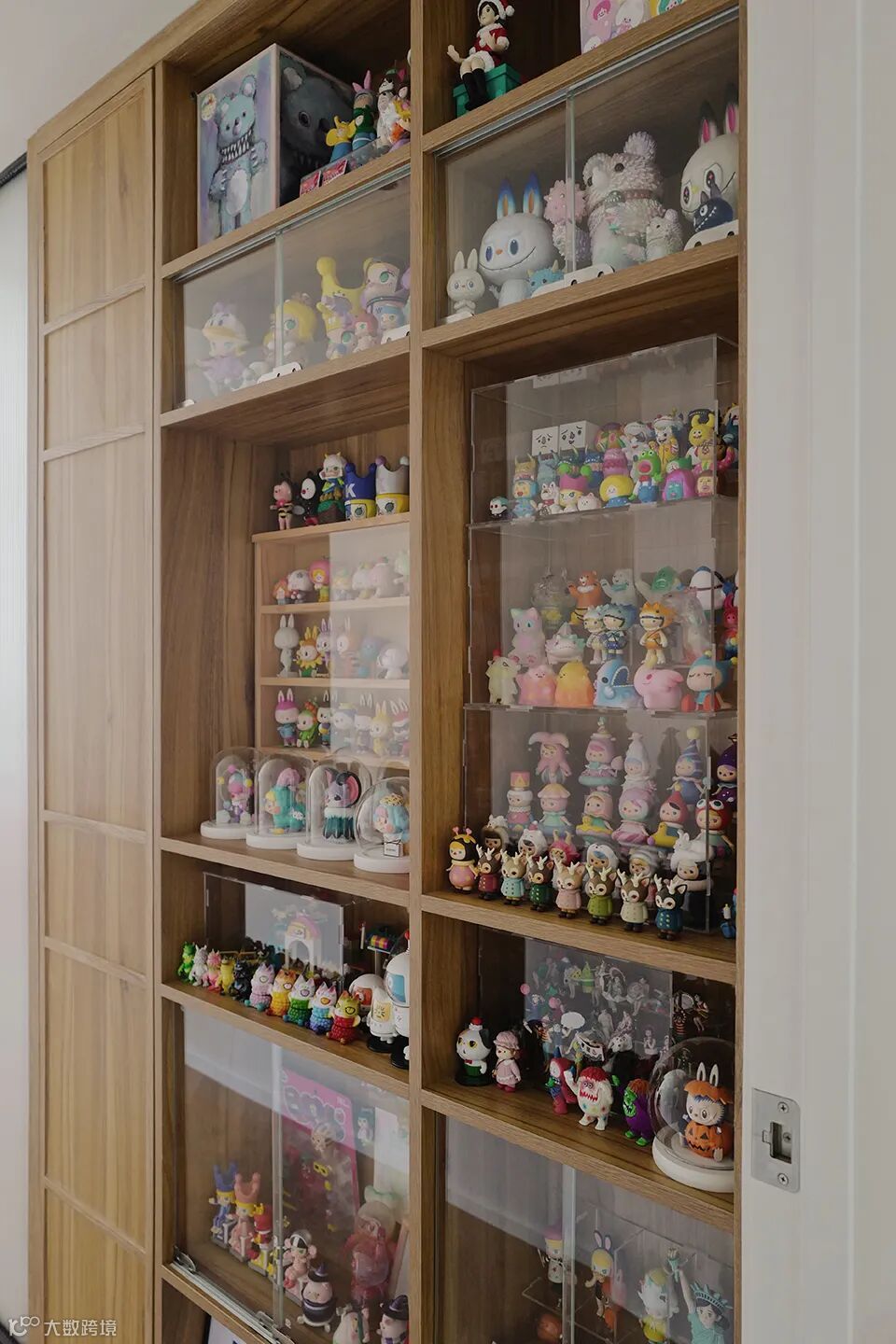 盲盒玩偶们被放置在通往主卧的走道中,每当经过展示柜看到一墙的娃娃,绝对令人幸福感满满。