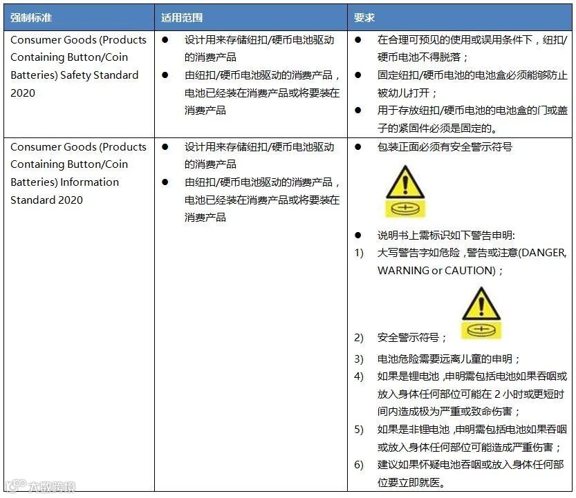 2020年12月22日,澳大利亚政府正式生效4个强制标准来减少因使用纽扣/硬币电池造成的伤亡风险。强制性标准包括18个月过渡期,从2022年6月22日开始,供应商必须符合该标准要求。