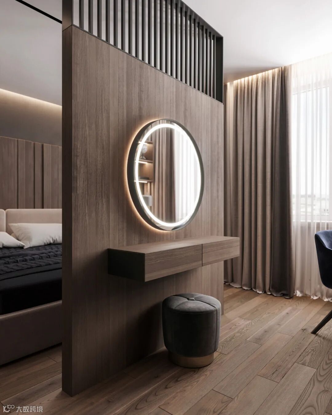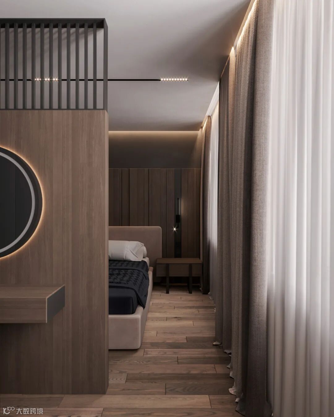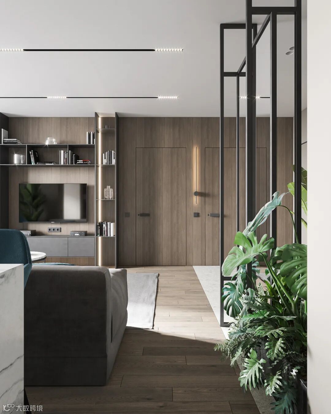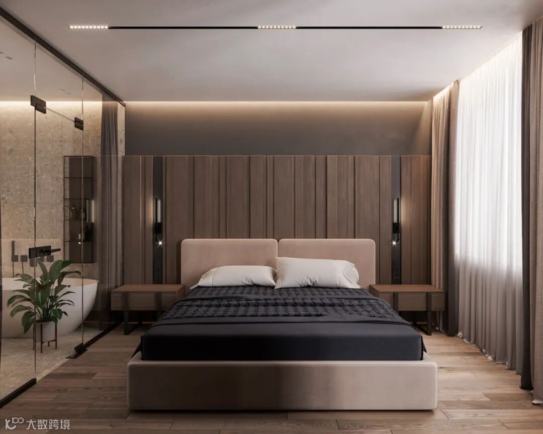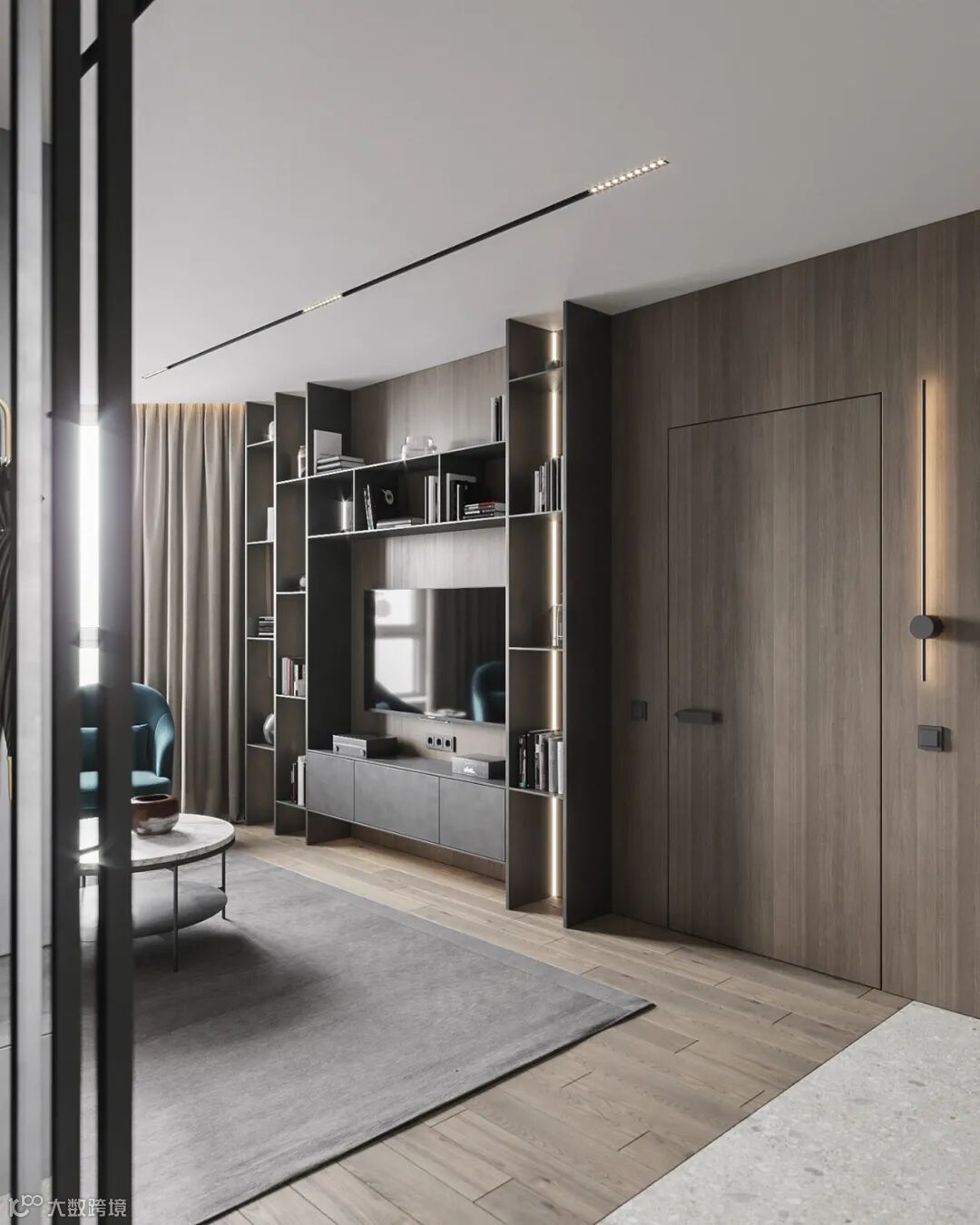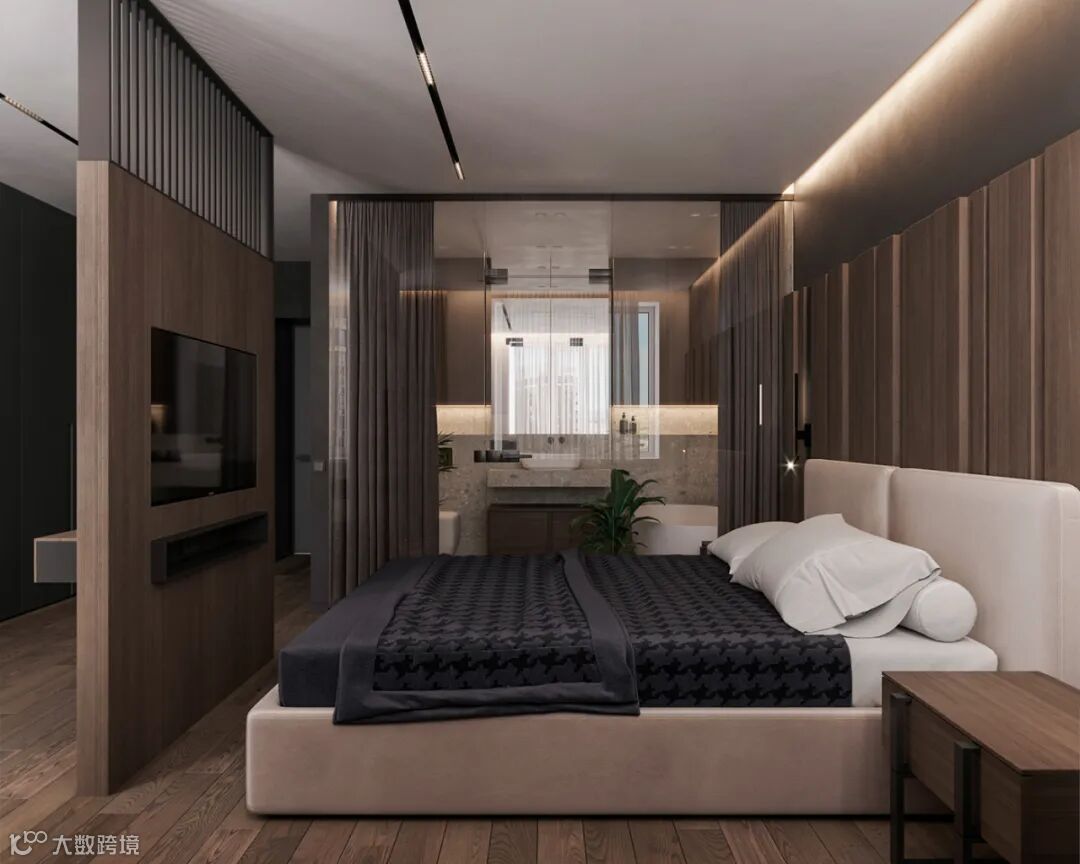 细看能发现这里藏着一扇门么?通往主卧的门刚好在电视机背景这个位置,为了整体的统一性,在木饰面的基础,加入隐形门,保持背景墙的大气设计。