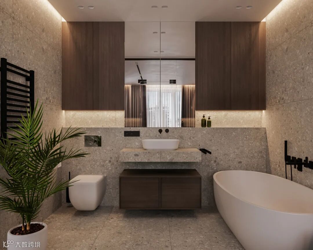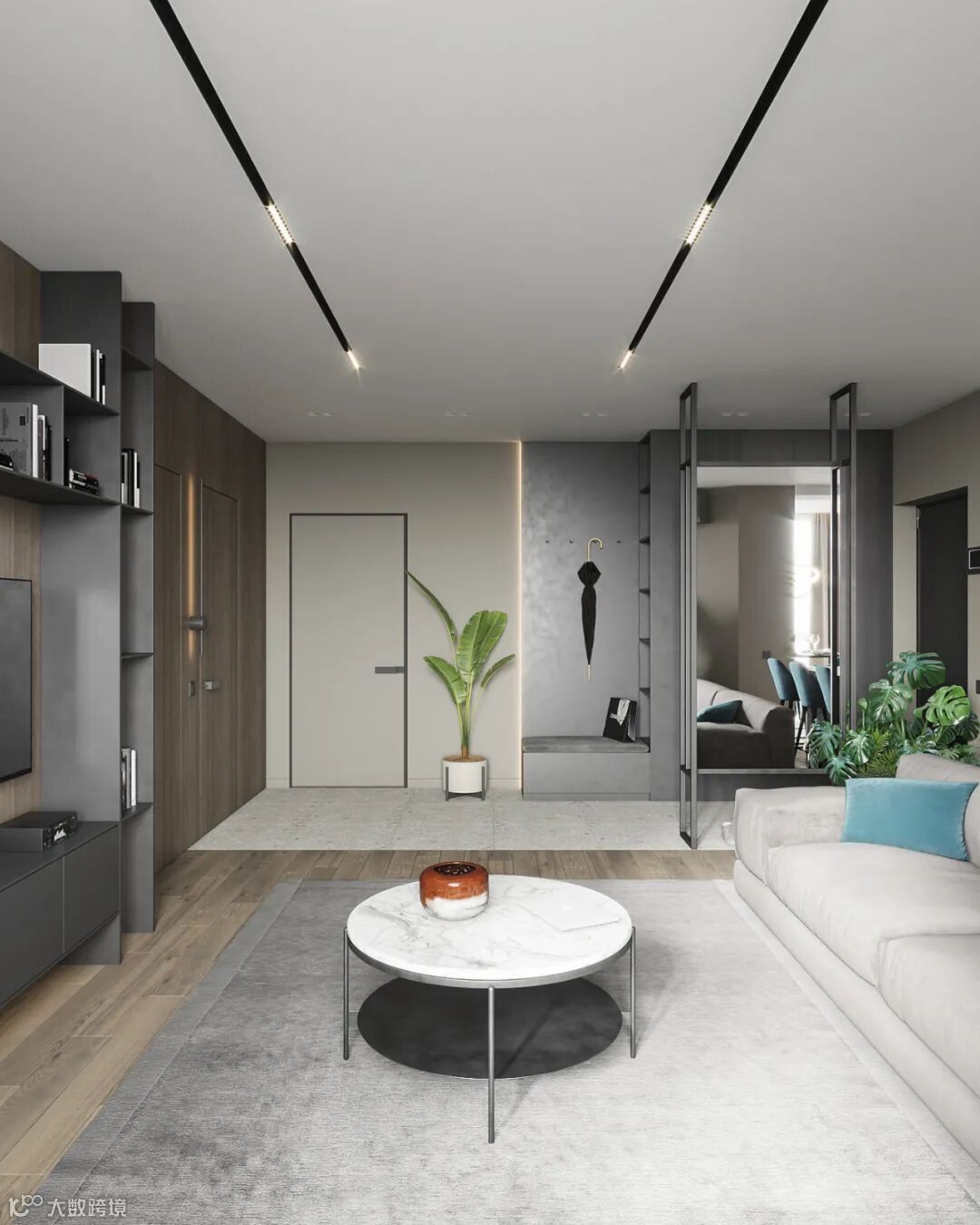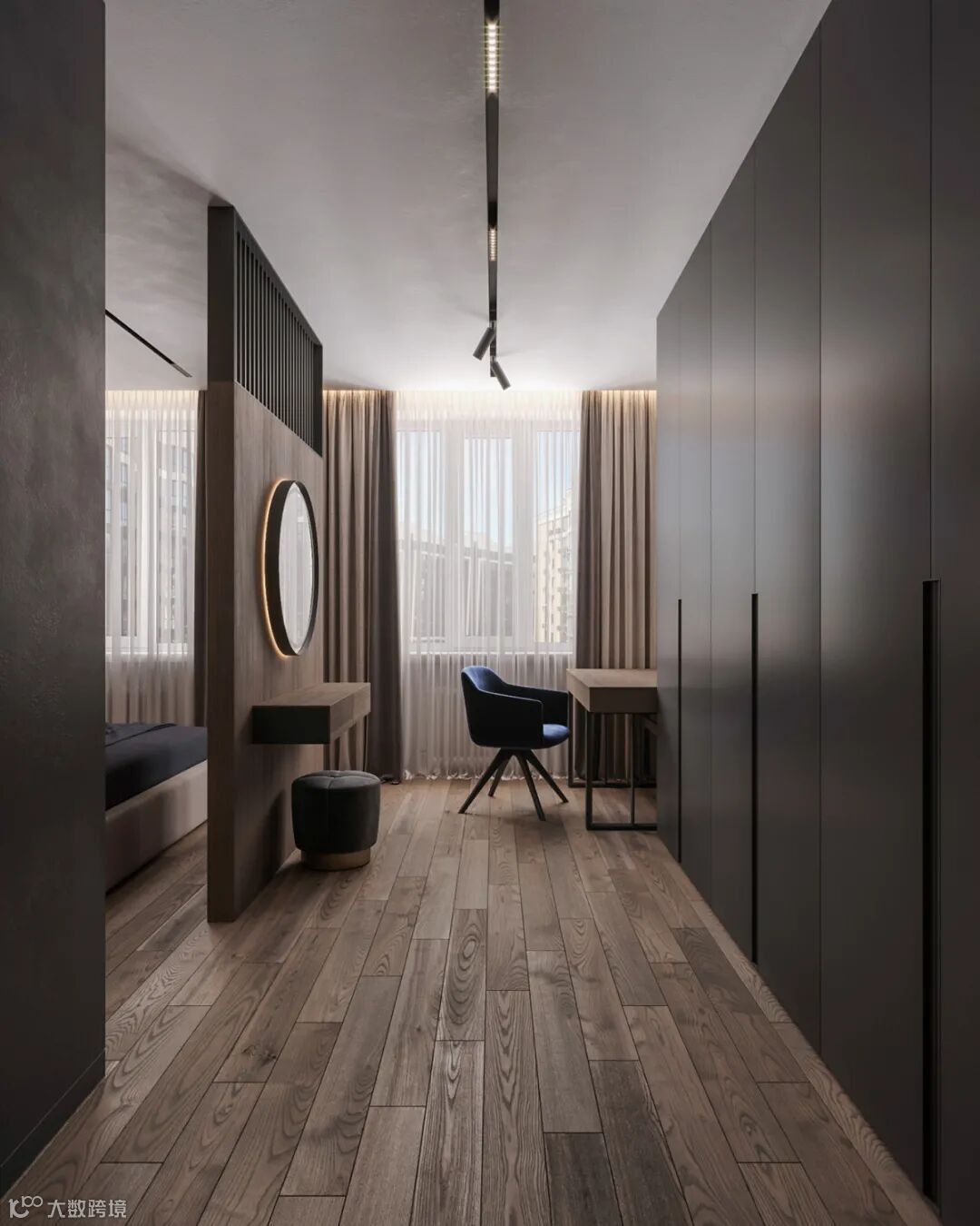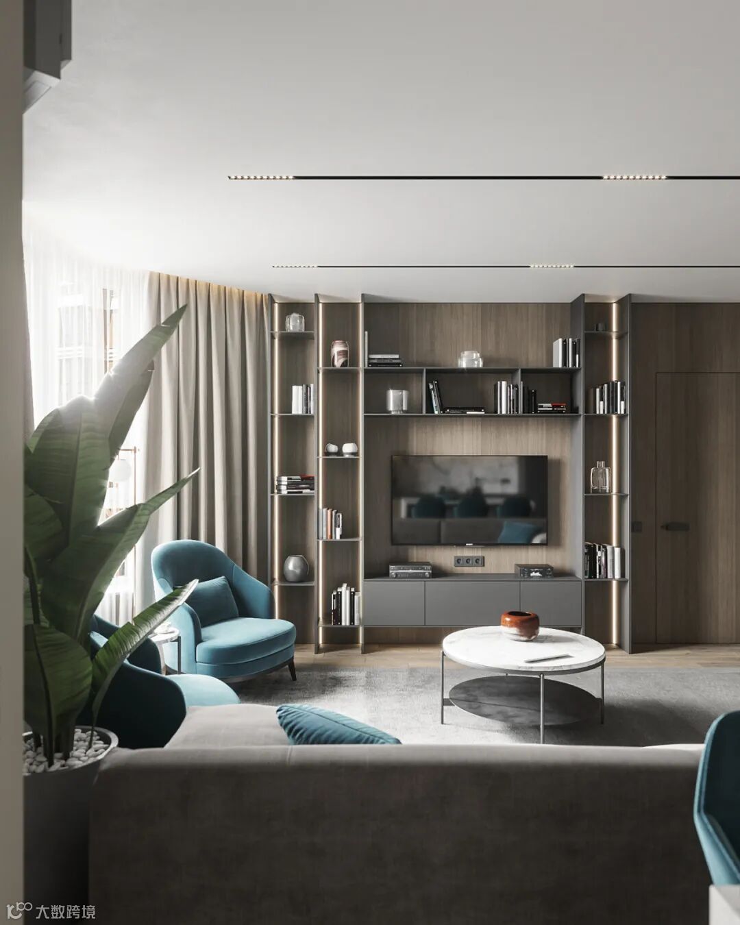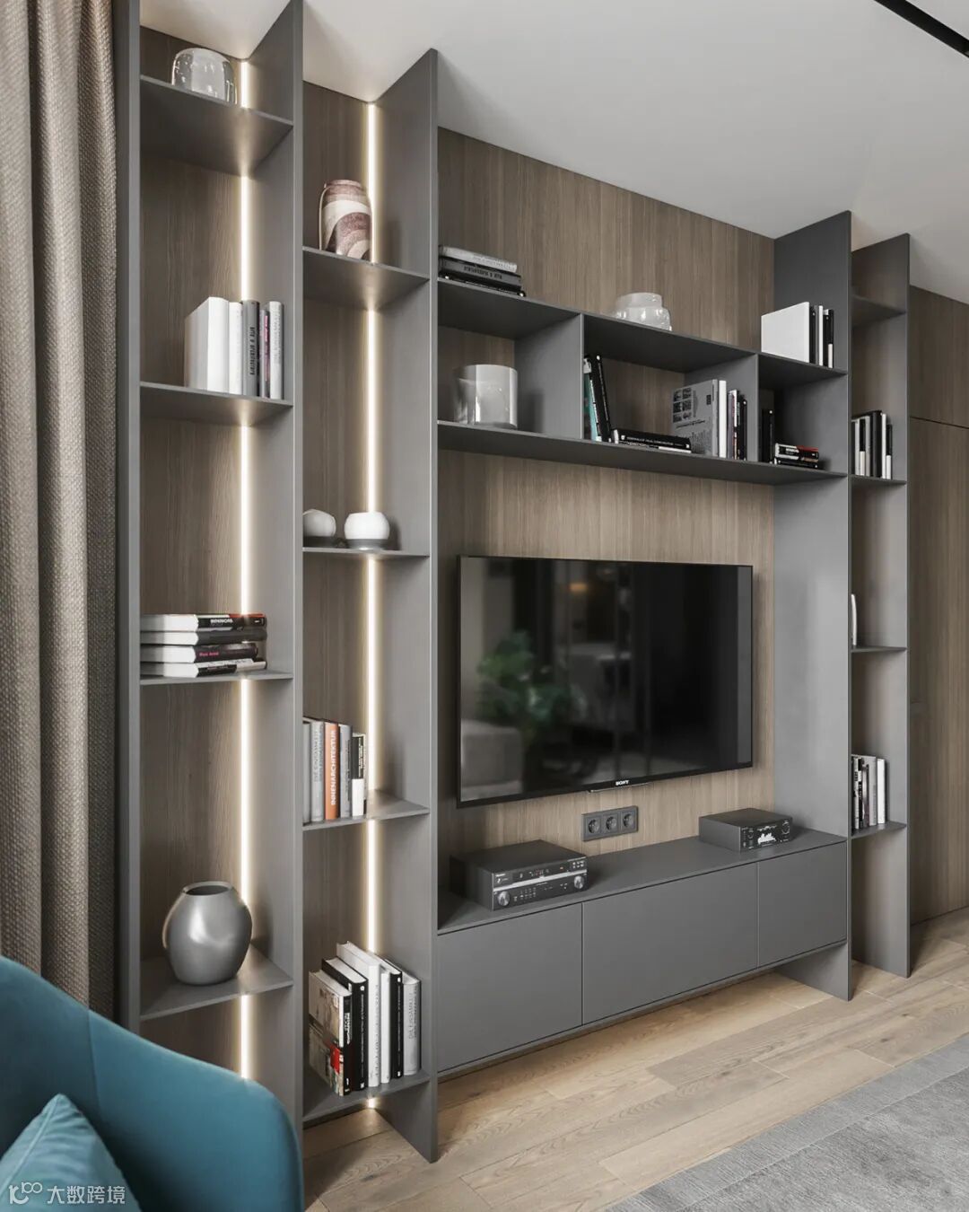 细看能发现这里藏着一扇门么?通往主卧的门刚好在电视机背景这个位置,为了整体的统一性,在木饰面的基础,加入隐形门,保持背景墙的大气设计。