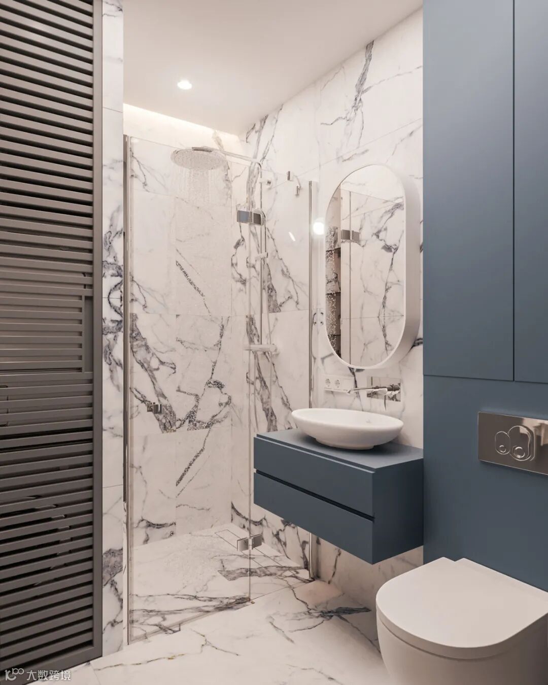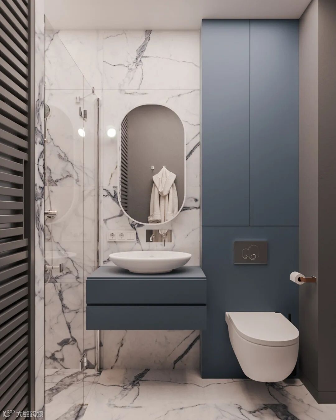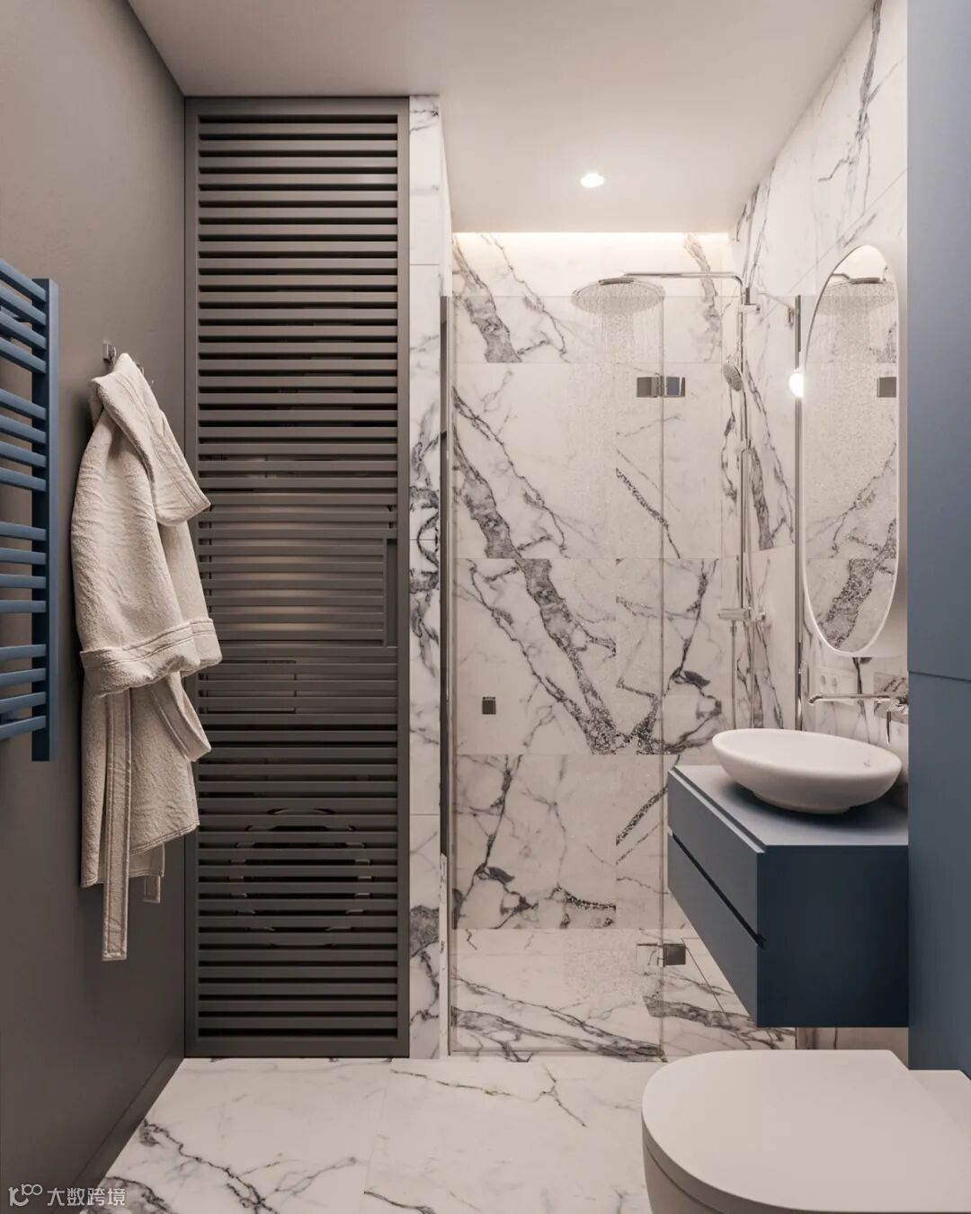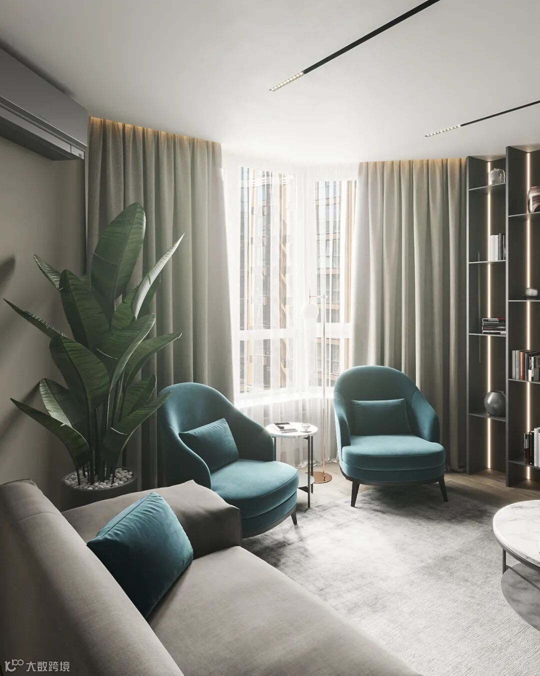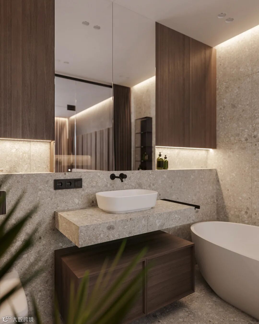 细看能发现这里藏着一扇门么?通往主卧的门刚好在电视机背景这个位置,为了整体的统一性,在木饰面的基础,加入隐形门,保持背景墙的大气设计。