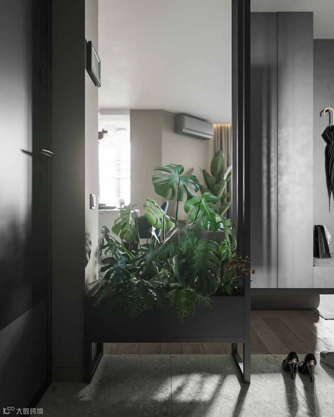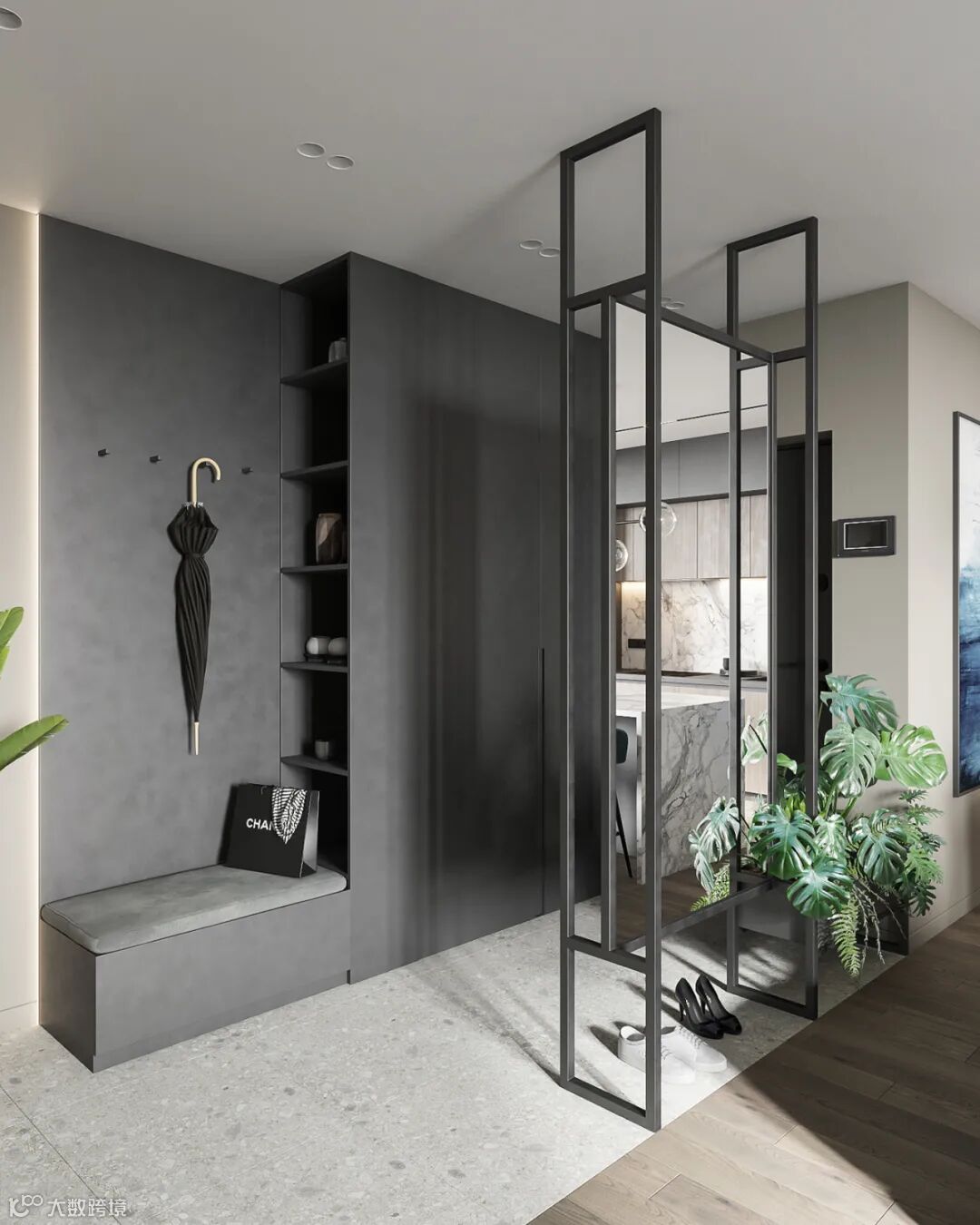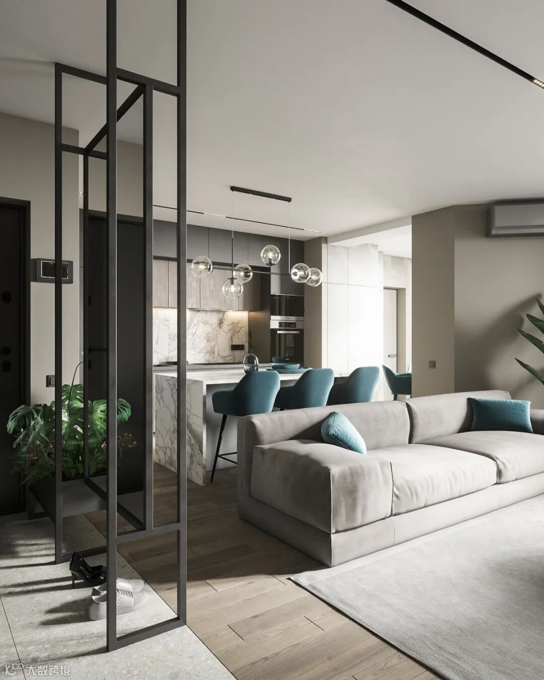 门厅处设置一个镂空的铁艺,增加客厅的透视性,也保证自然光线在室内的传播范围的扩大。增加了灵动感,同时也可以作为屋主的穿衣镜,达到一镜多用的效果。