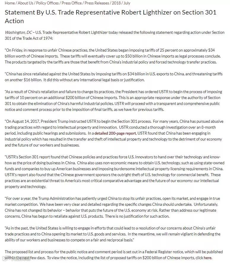 2018年6月15日,美国政府依据301调查单方认定结果,宣布将对原产于中国的500亿美元商品加征25%的进口关税,其中对约340亿美元中国输美商品的加征关税措施将于7月6日实施,对其余约160亿美元商品的加征关税措施将进一步征求公众意见。