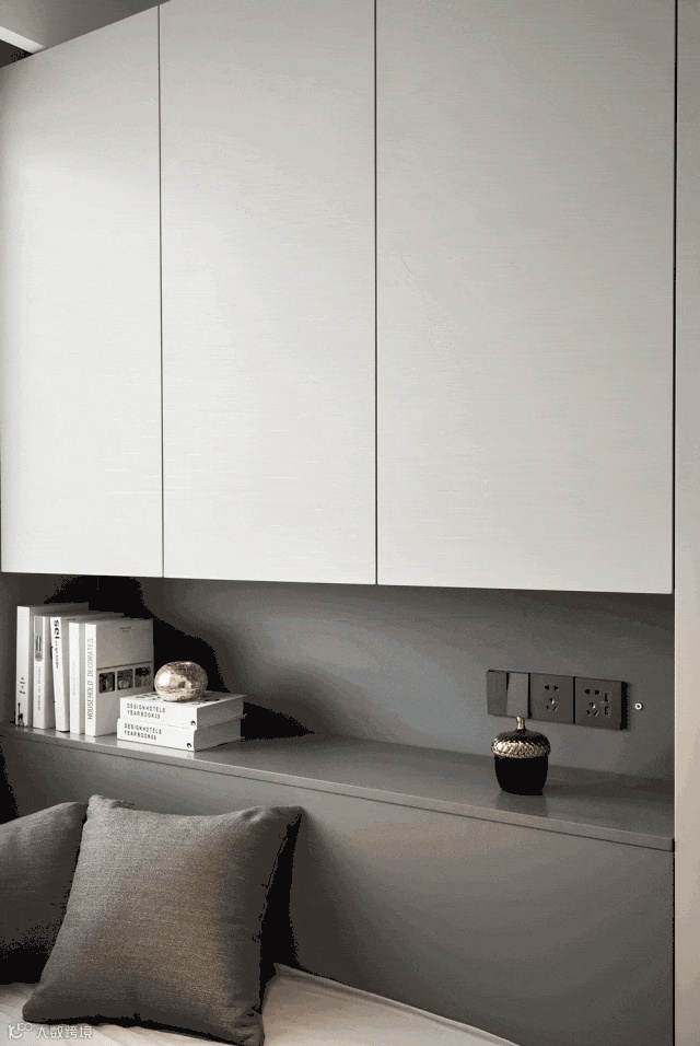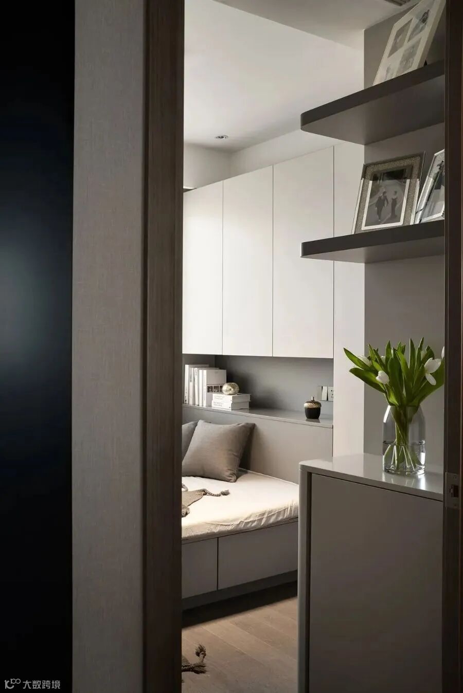 浅灰色榻榻米床占据房间一侧,床体下方是抽拉式收纳柜,