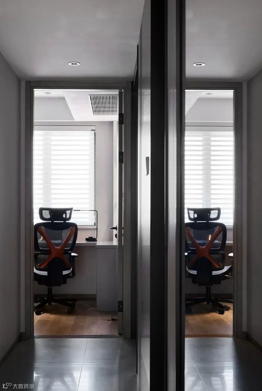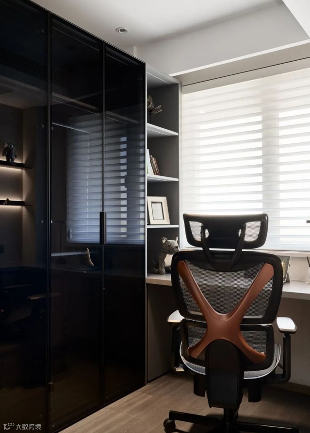左侧书柜延伸出的书桌靠着窗台,大采光办公阅读更舒适。