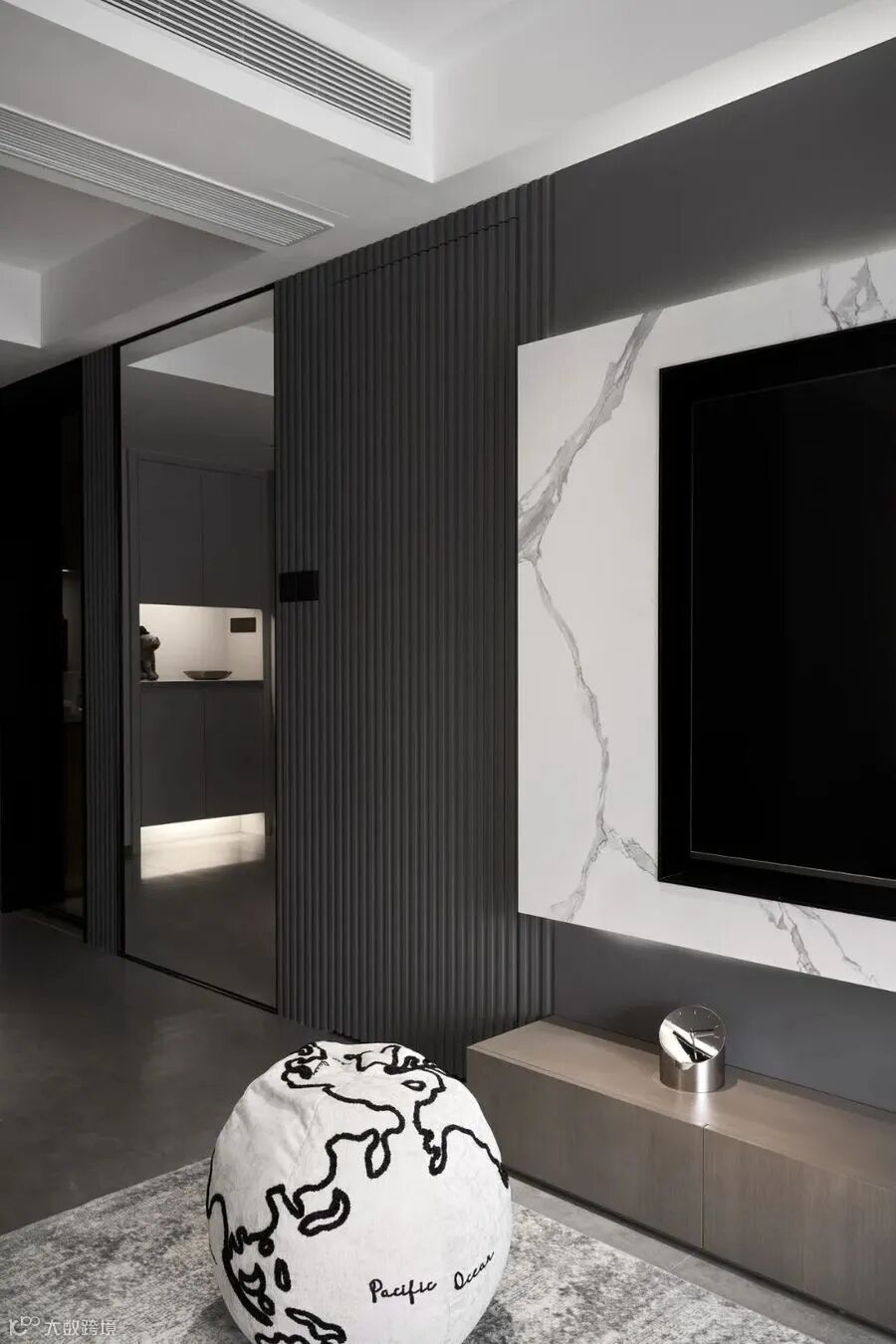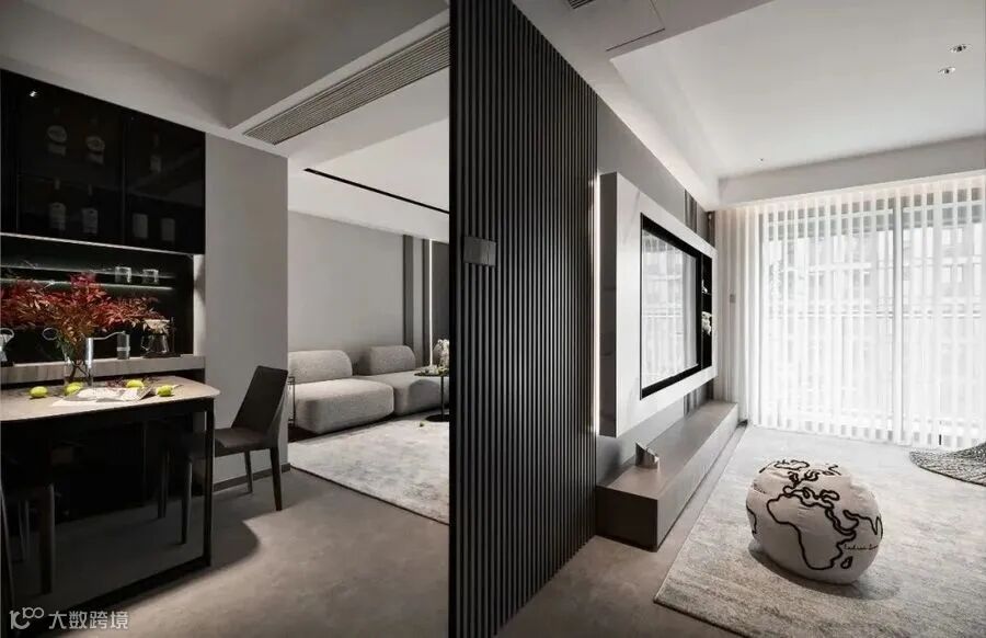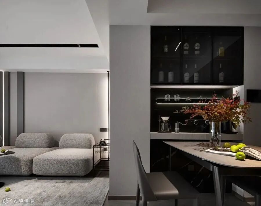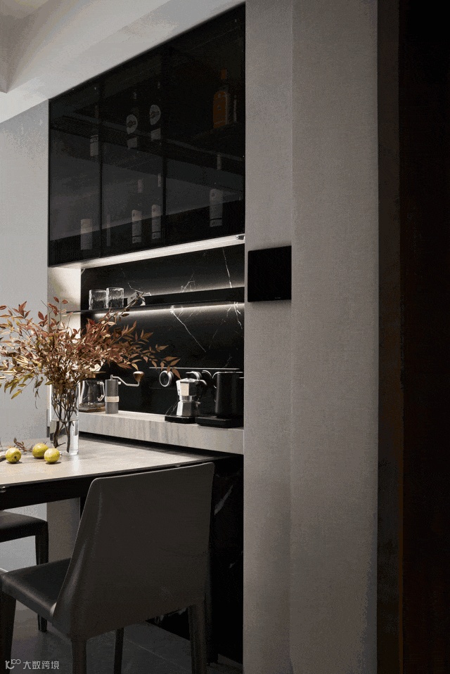 嵌入式餐边柜采用黑色背景,与浅灰色形成对比,