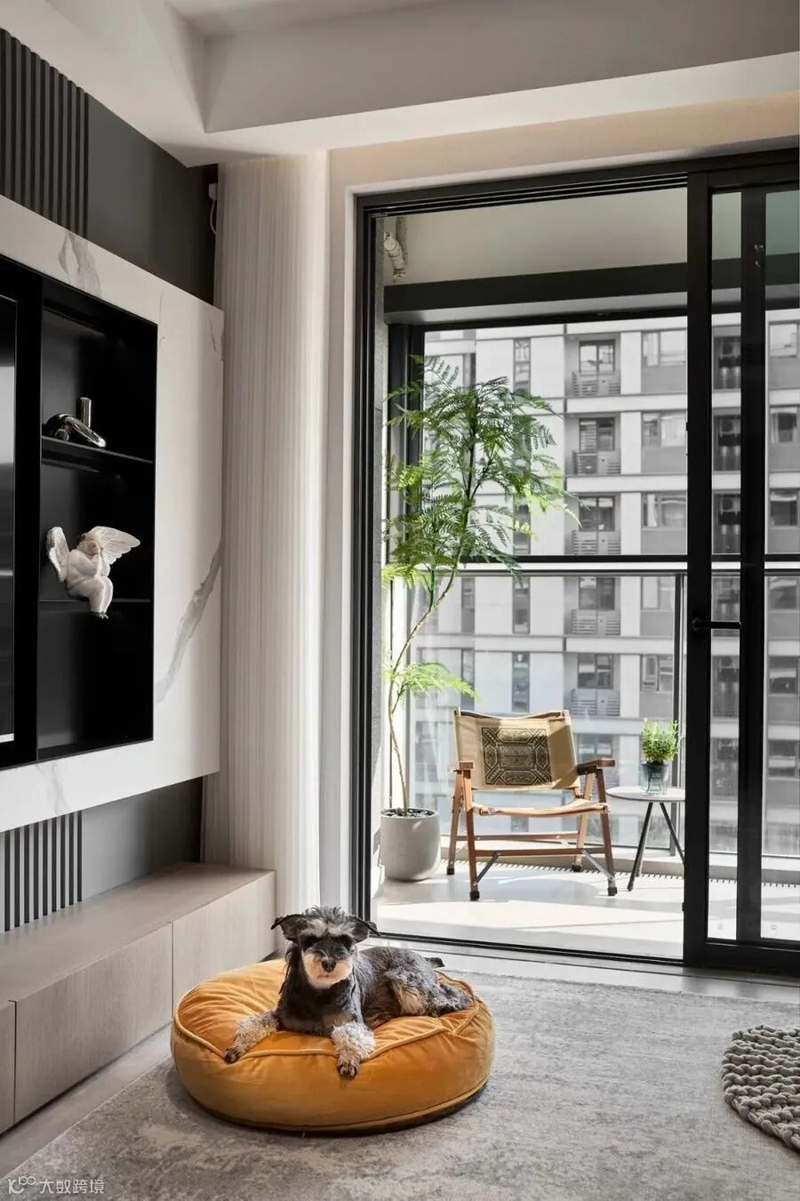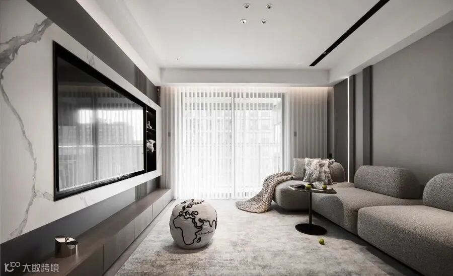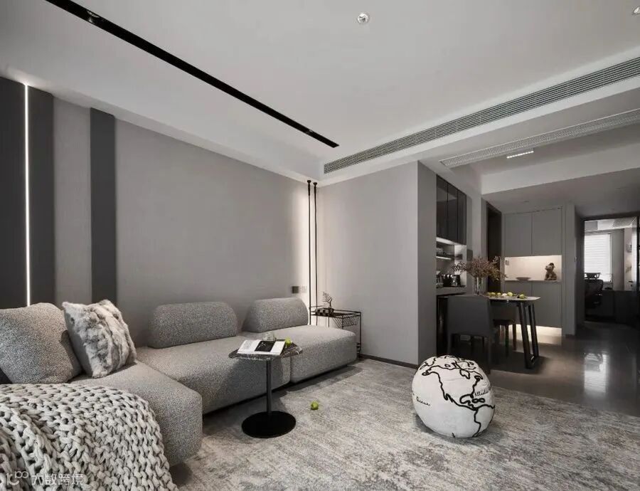 客厅以大片留白和浅灰色为主轴,没有多余的装饰。