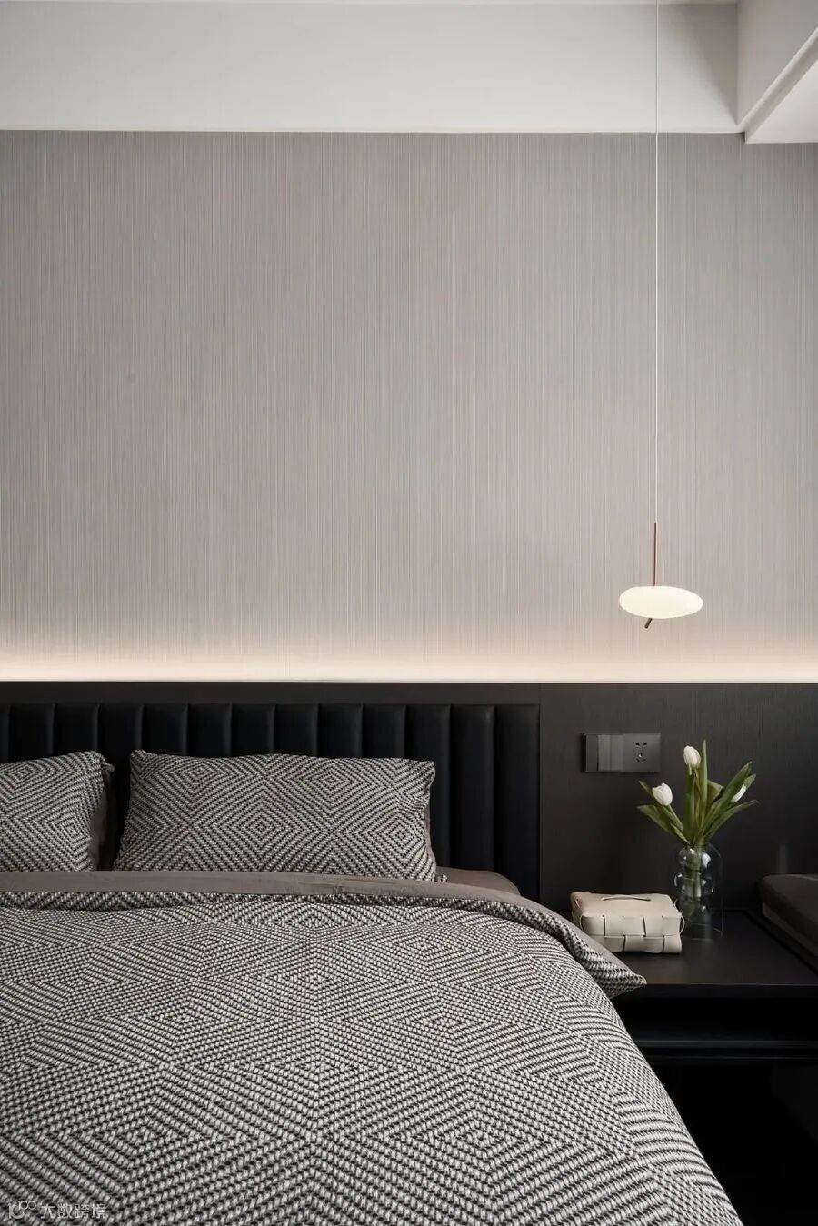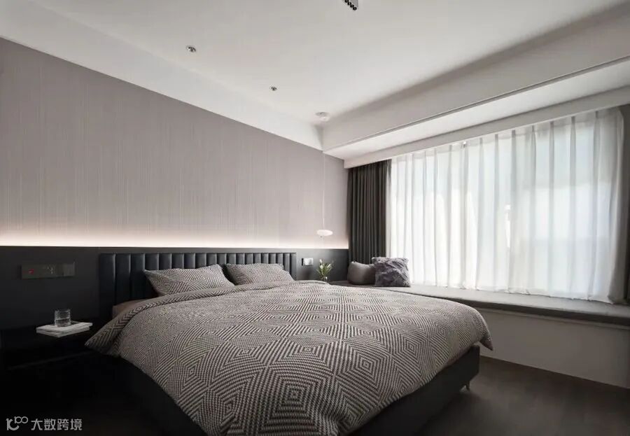 床头墙面没有复杂的装饰,深灰色拼接背景延伸至飘窗,