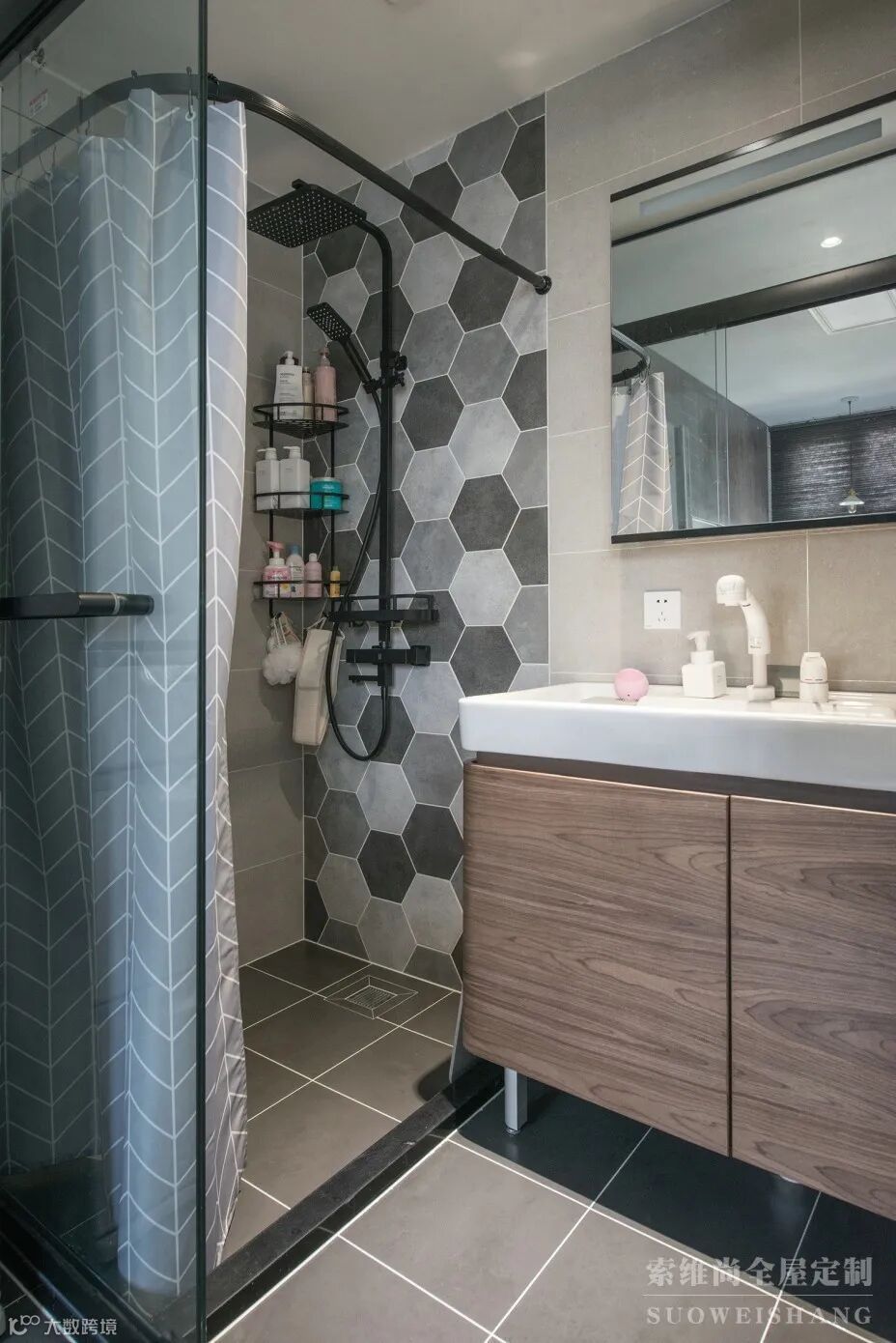 洗手台和淋浴区灰色与木色的结合搭配,淋浴区内的六边砖背景墙显得更有格调感,用浴帘来代替玻璃隔断,也更为宽敞一些。