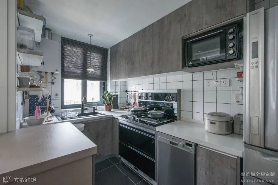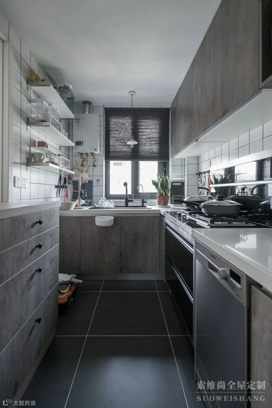 厨房一侧的墙面上用隔板代替吊柜,既有收纳又不会显得压抑。