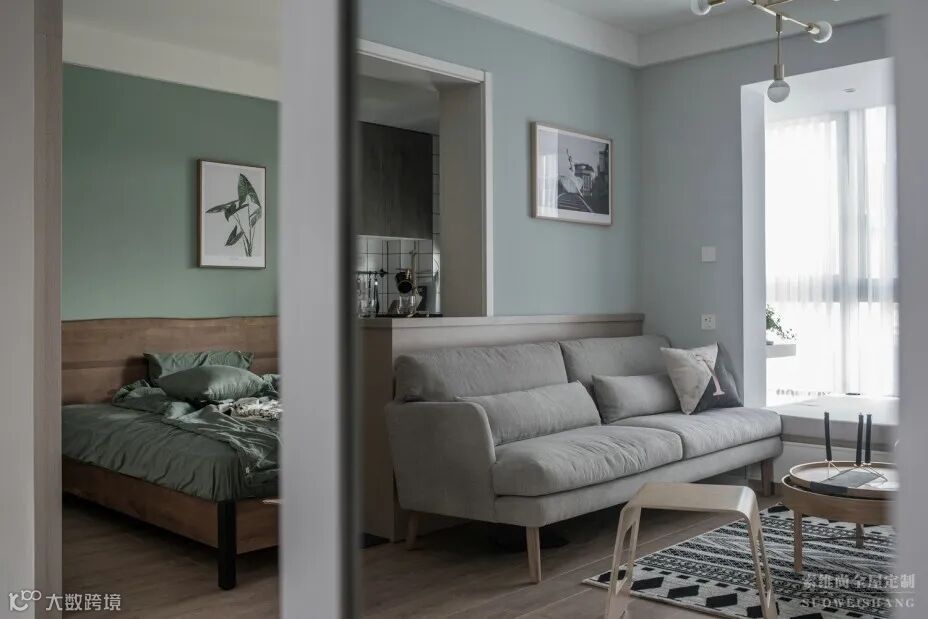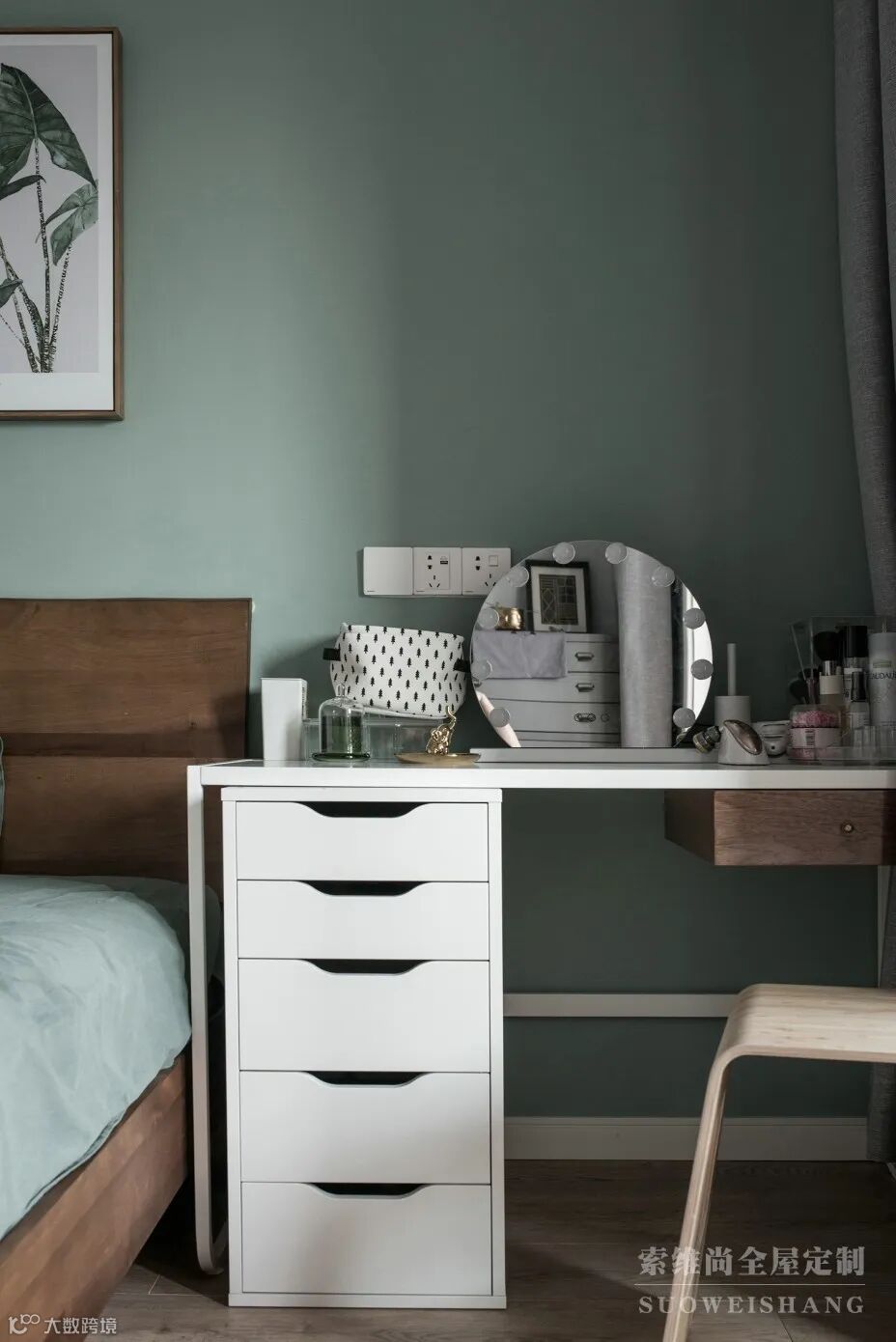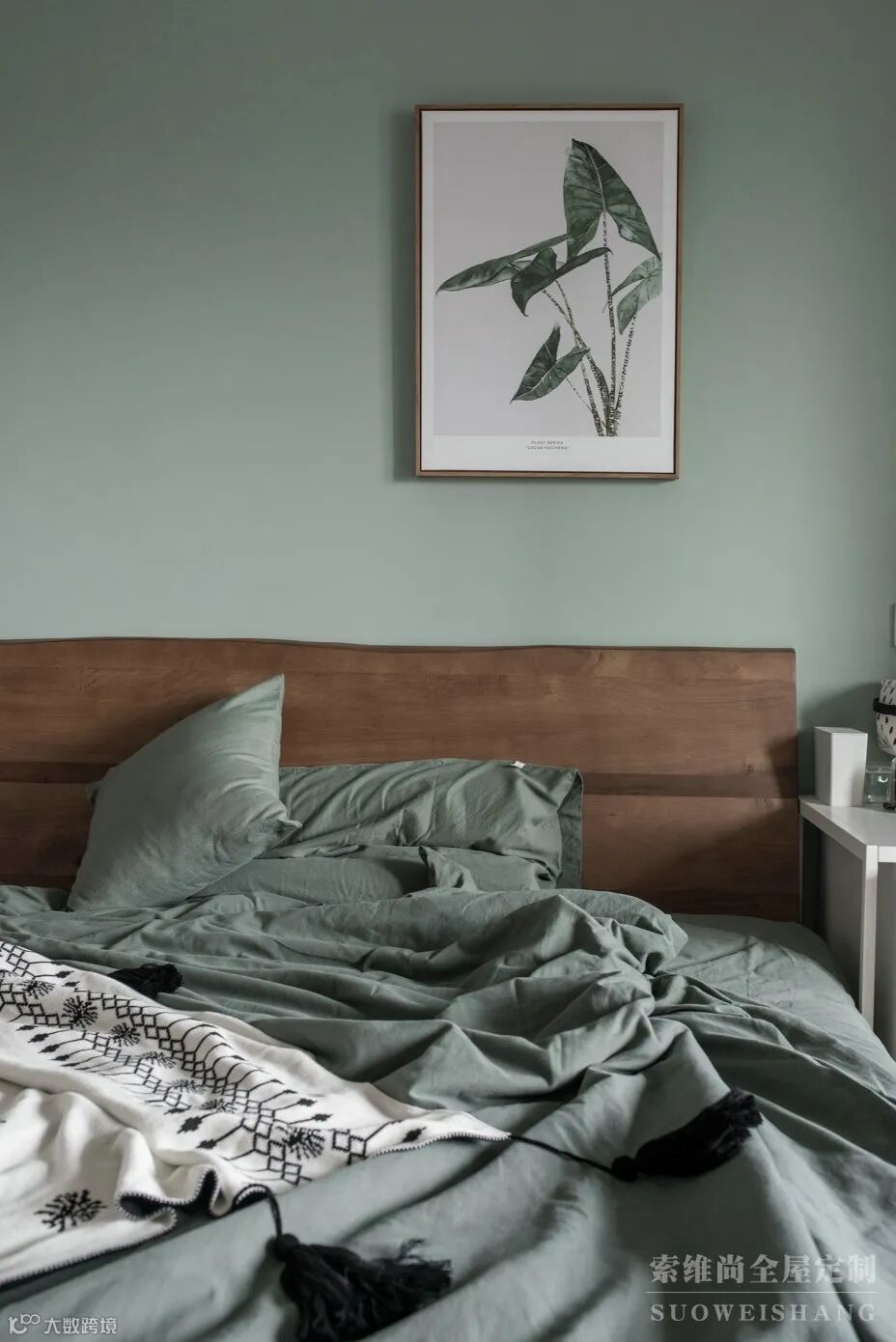 绿色背景墙,给卧室增添些许宁静、平和的感觉,床品也选择了绿色与背景墙形成呼应,整体视觉更饱满。