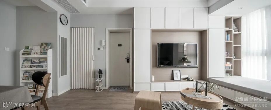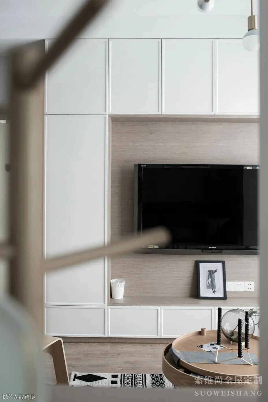 电视机背景墙做成了收纳型的墙面,以此来弥补房间储物空间不足的缺点。