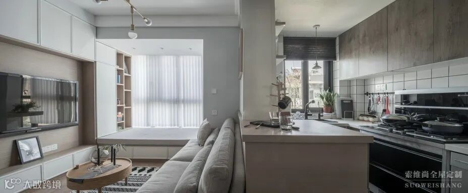 沙发旁的窗前打造了一个飘窗,飘窗采用一体式定制设计,将墙面也利用起来,设计几个储物格,收纳展示两不误。
