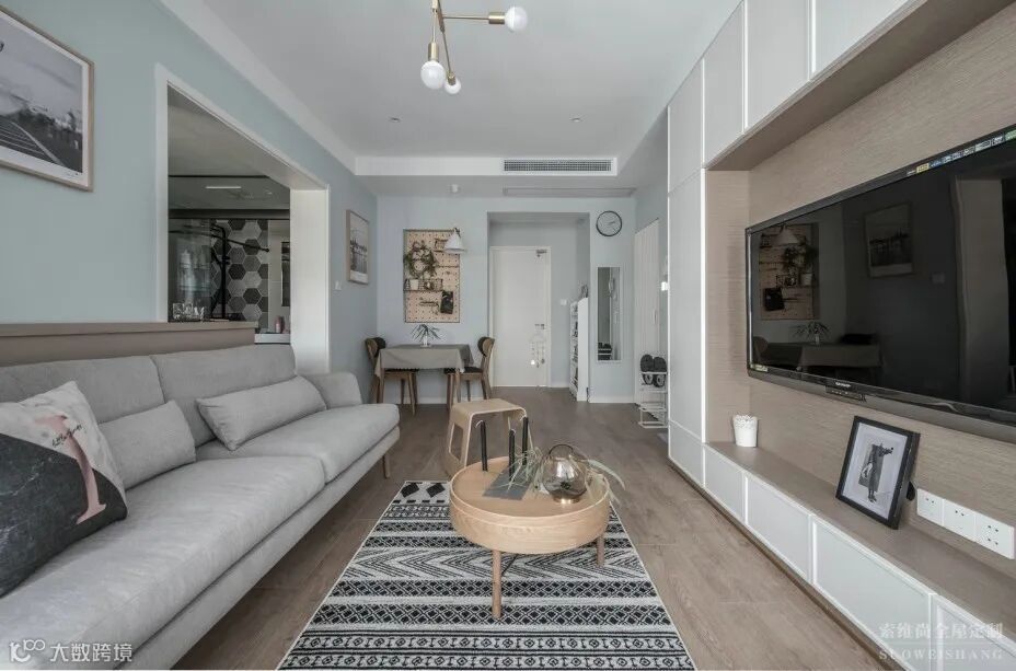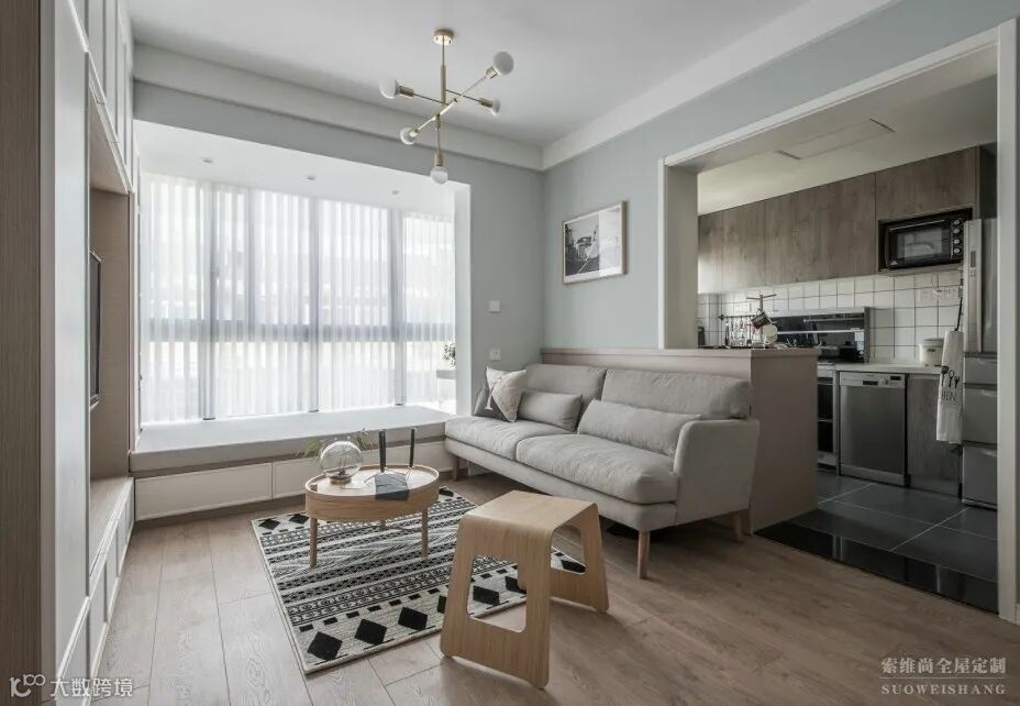 今天小编分享的是一套简约小户型住宅。房屋整体空间使用黑白灰和木色搭配,清新也不失时尚感。没有玄关走廊,把客厅、餐厅的一部分都连起来,显得格外的宽敞。
