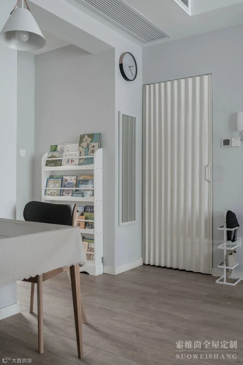 门边上摆放了一个杂志架,书籍拿取方便。推拉门遮掩的卫生间门边留一个小架子放常换拖鞋,整洁实用。